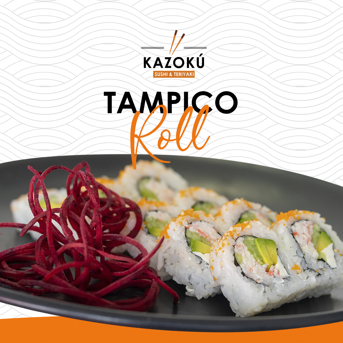 Tampico Roll Aguacate, Queso Crema, Pepino, Cangrejo con chile, serrano, cebollin, ajonjoli