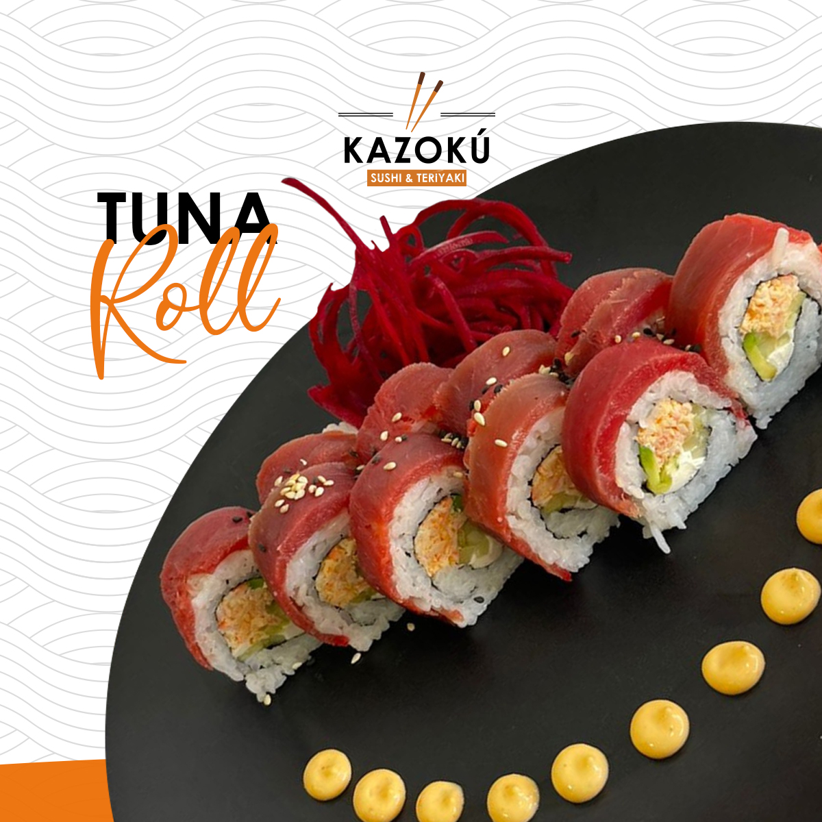 Cangrejo spicy, queso crema, pepino y aguacate, forrado de atún fresco y ajonjolí.