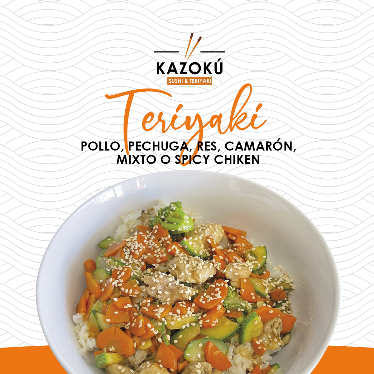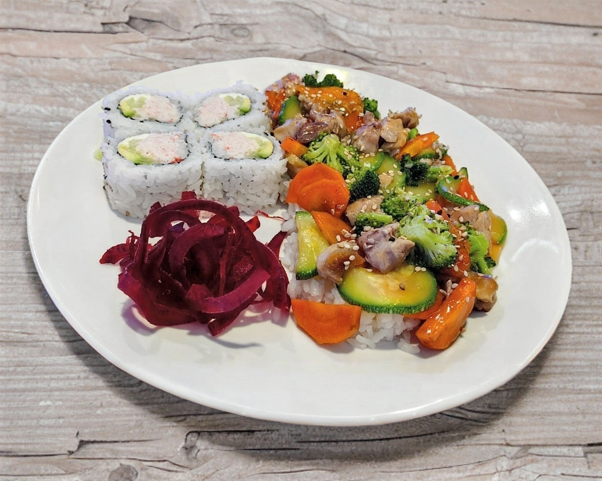 Teriyaki de Pollo + Ensalada + Arroz Blanco, + 1/2 California Roll
