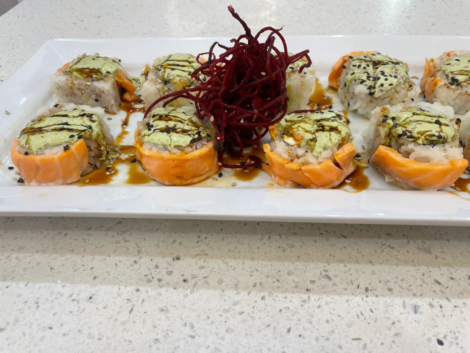 Salmón fresco, camarón, cangrejo, queso crema, aguacate, pepino, con spicy gratinada, salsa dulce y ajonjolí.