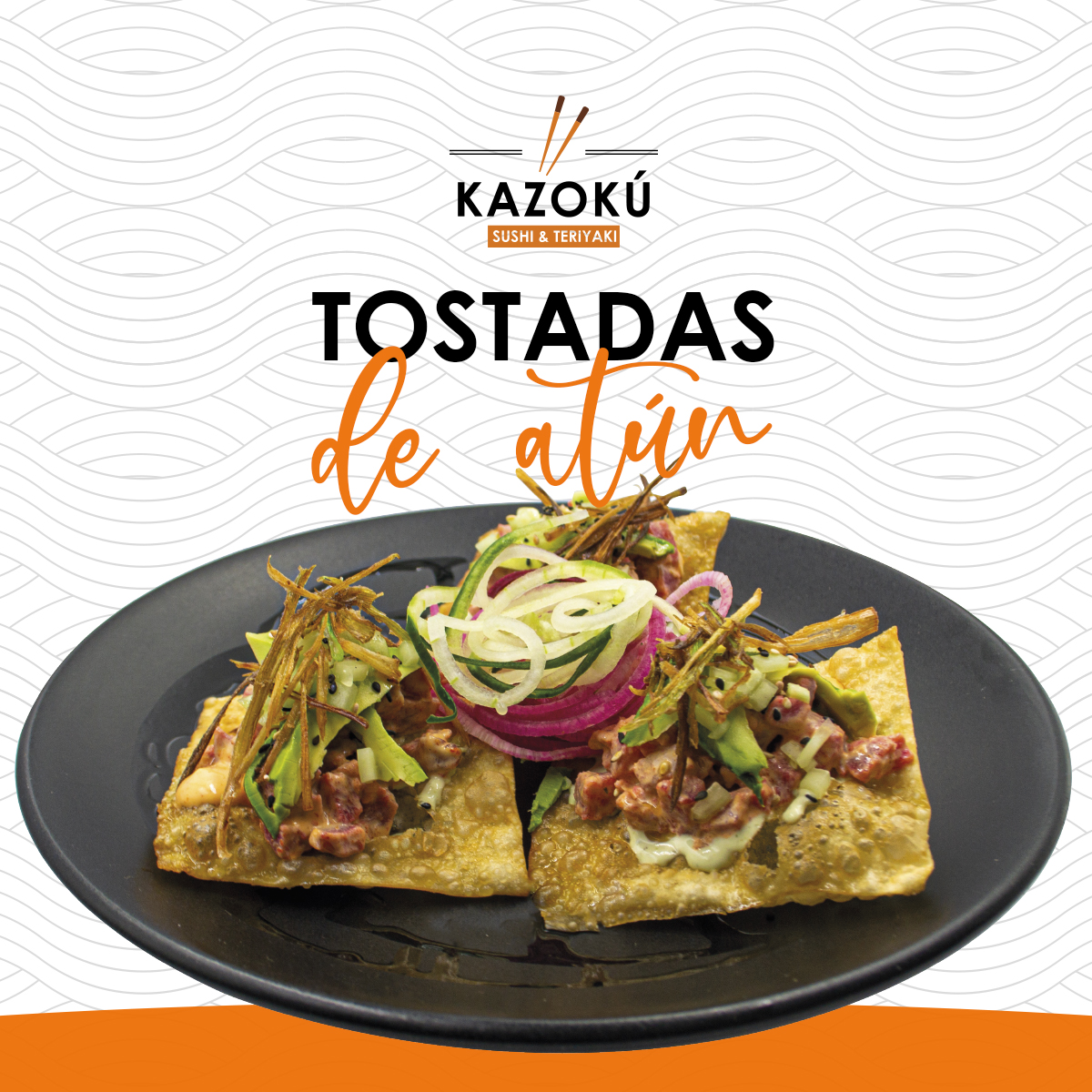 Cubos de atún montados en crujiente harina de wonton aderezadas con spicy mayo cubos de aguacate y pepino bañadas en salsa oriental y un toque de crema de cilantro.