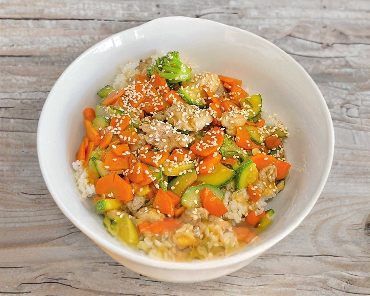 Cubos de Pechuga a la plancha sobre una cama de de arroz con champiñones bañada en salsa teriyaki.