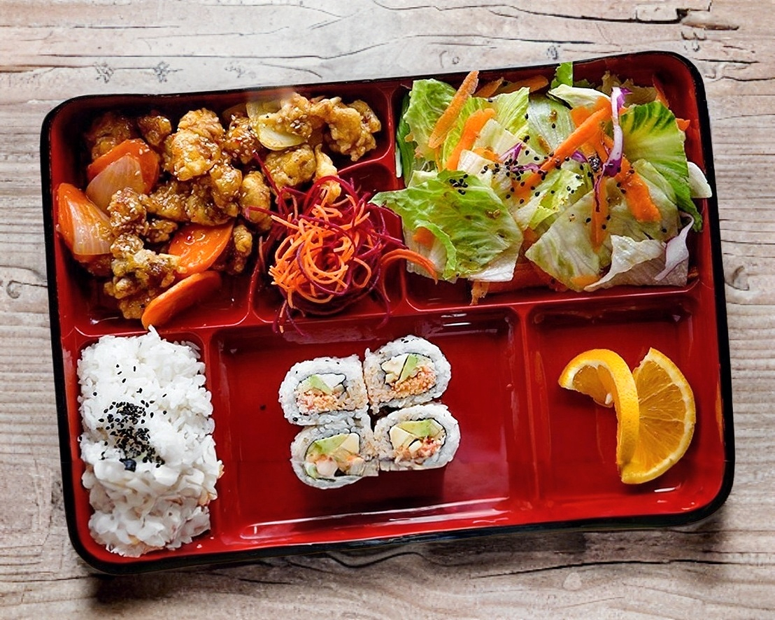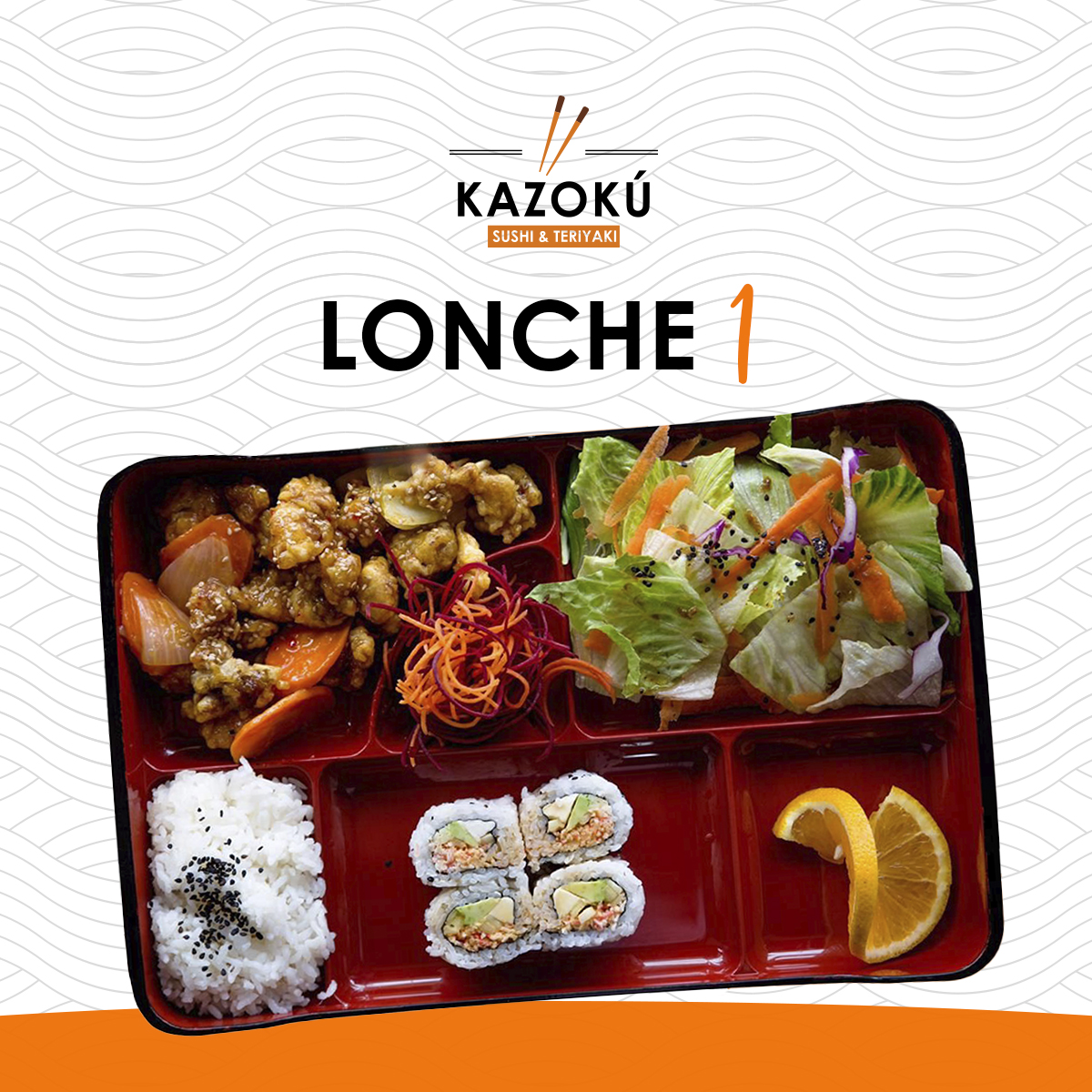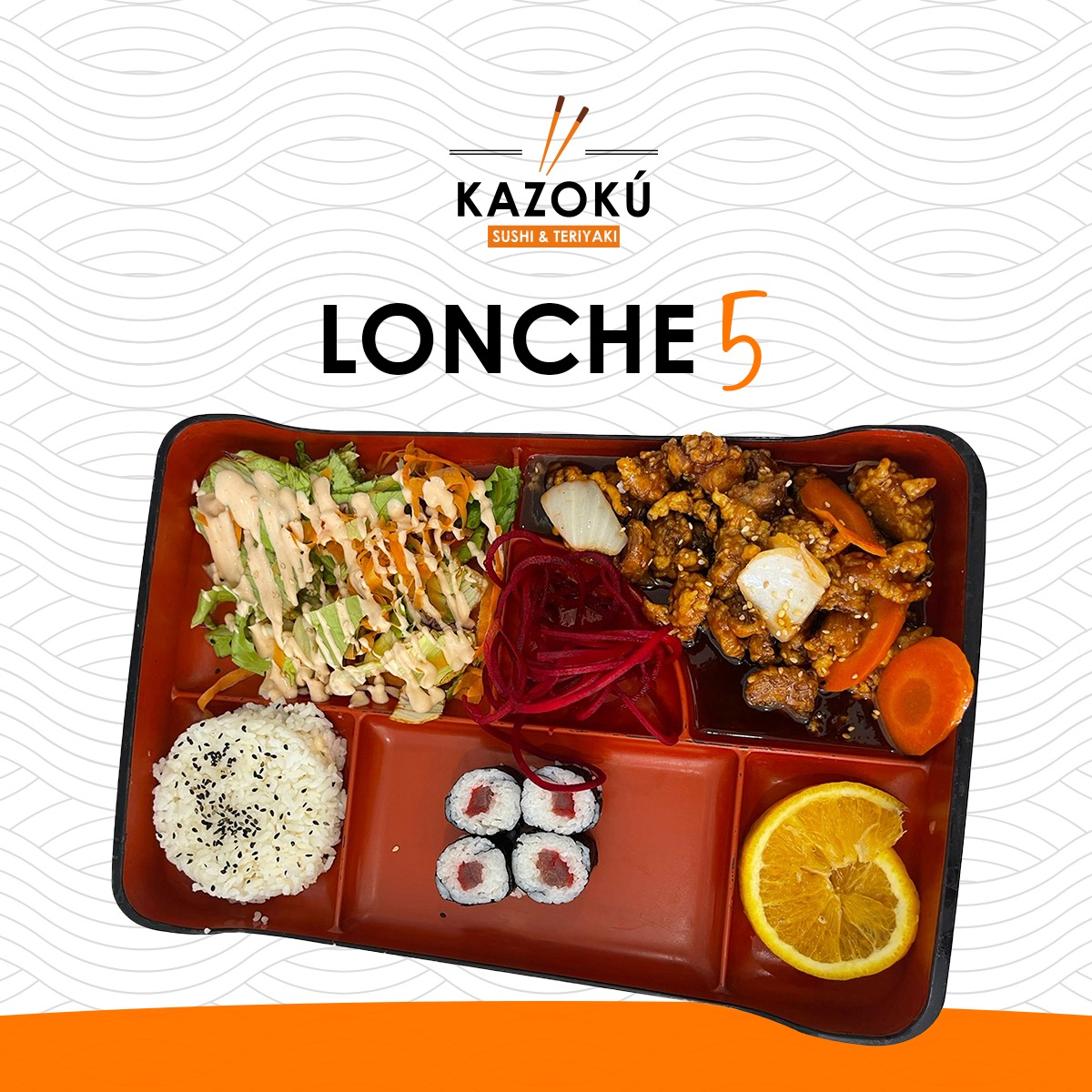 Orange Chicken + Ensalada + Arroz Blanco, + 1/2 Cangrejo Roll