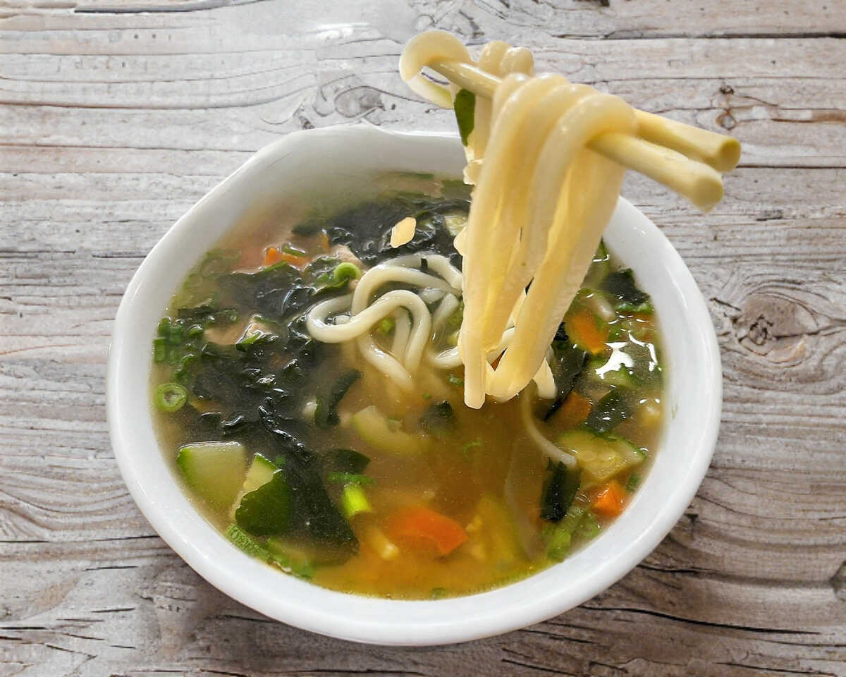 Verduras, pollo, alga deshidratada, cebollín y fideo grueso le dan la esencia oriental a esta sopa.