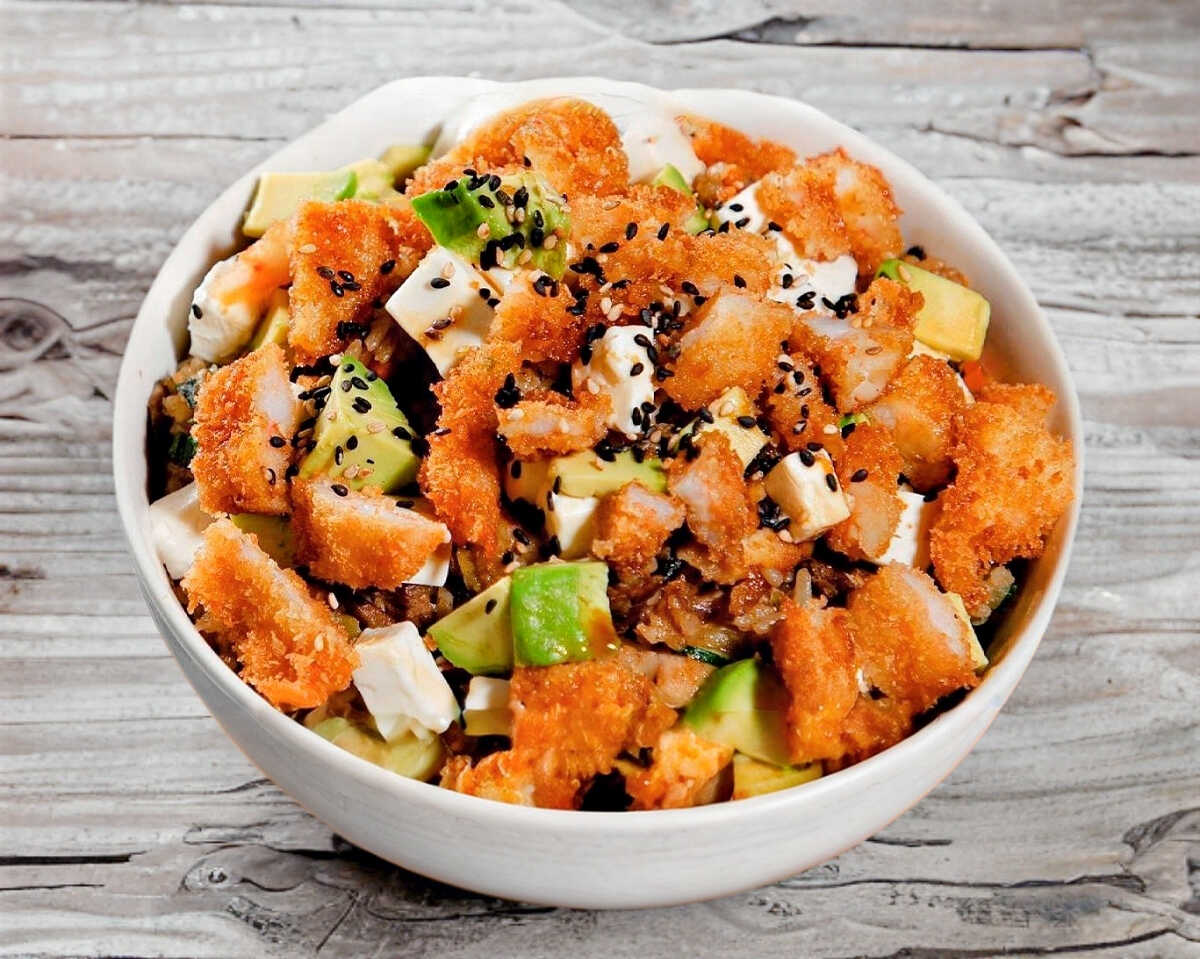 Camarón con pollo y verduras frito, coronado con camarón empanizado, queso crema, aguacate y salsa dulce.