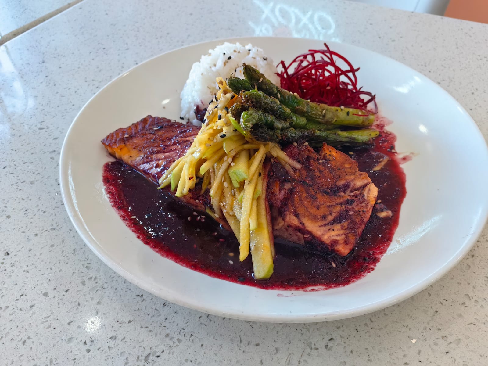 Salmon bañado en salsa de frambuesa con vino blanco arroz blanco, esparragos, salteados en mantequilla con ajo y pimienta , guarnicion de manzana verde con salsa de citricos y mostaza diyon