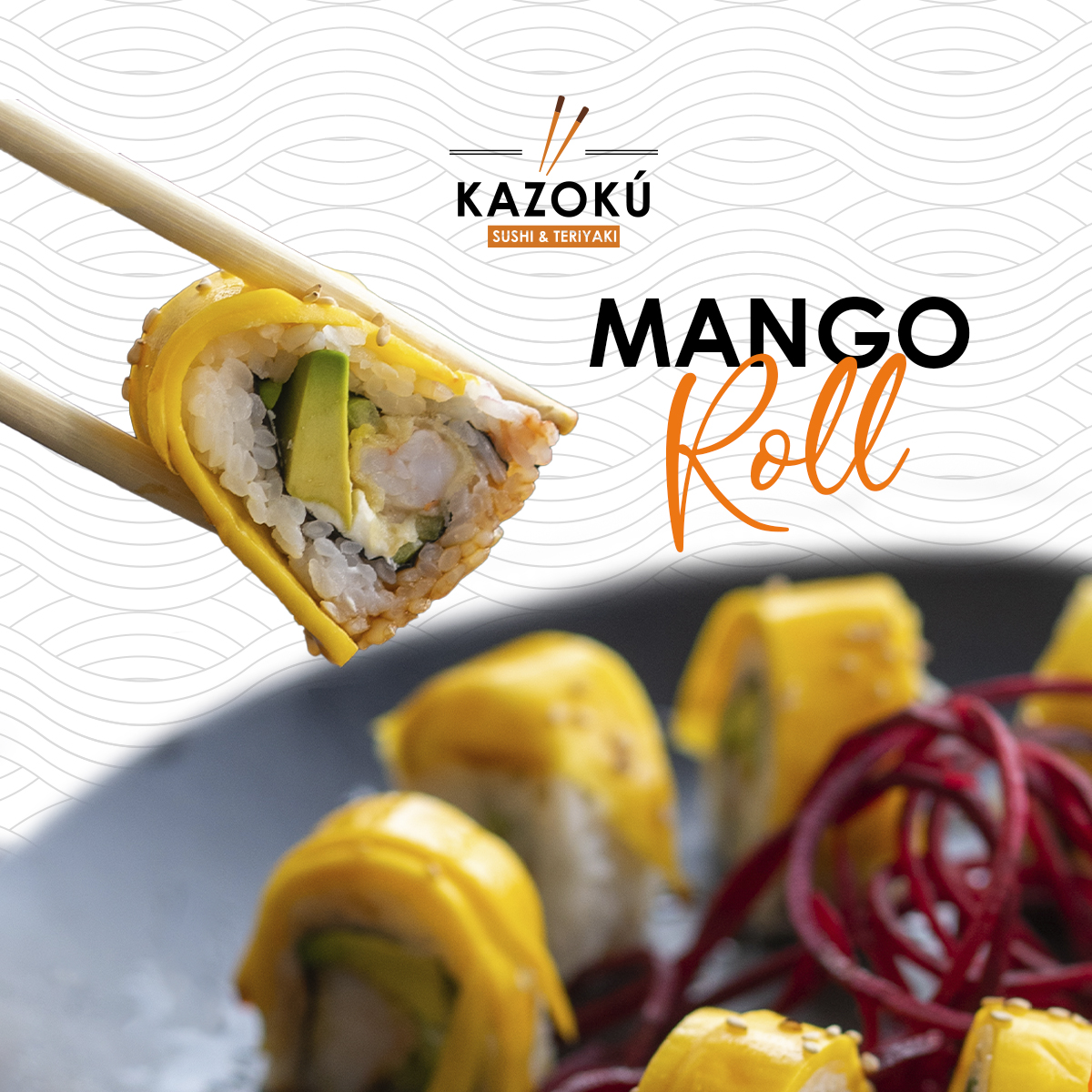 Camarón en tempura, queso crema, pepino, aguacate, forrado de mango natural con salsa dulce (por temporada).