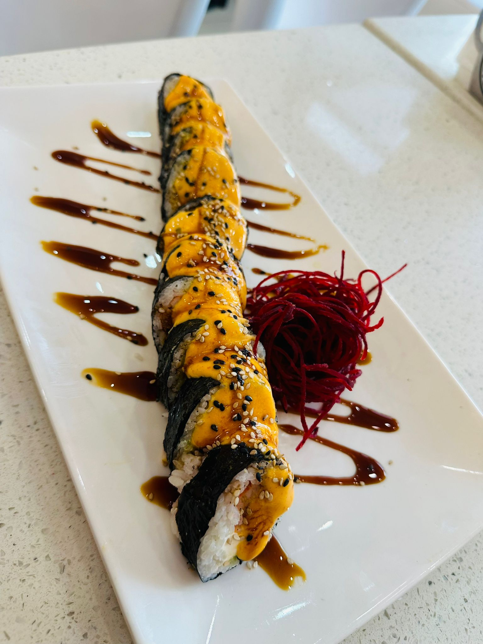 Cangrejo, queso crema, pepino, aguacate, forrado en alga de soya, encima camarón roca, salsa dulce y un toque de cebollín.