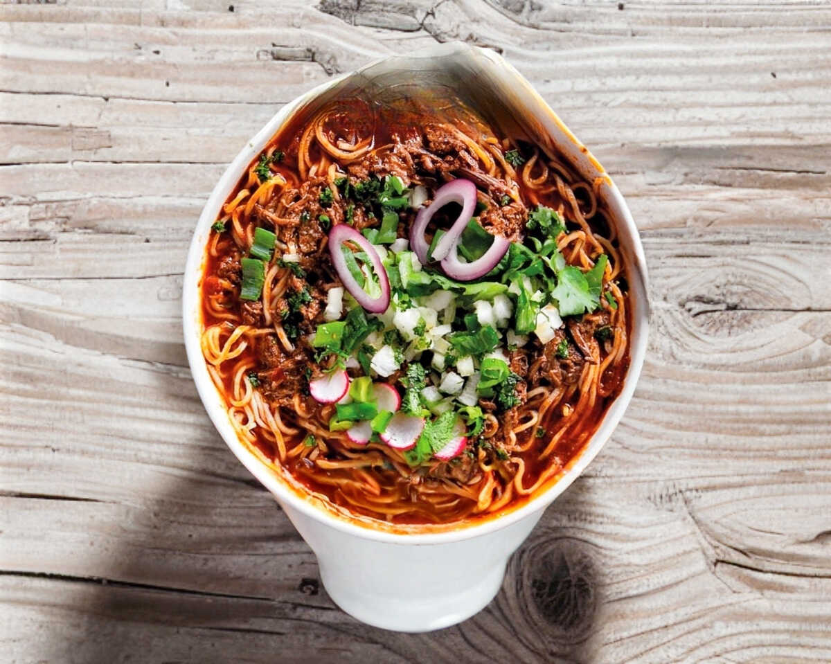Huevo, cebollín, chorizo, chistorra y chile de árbol (Fideo delgado).