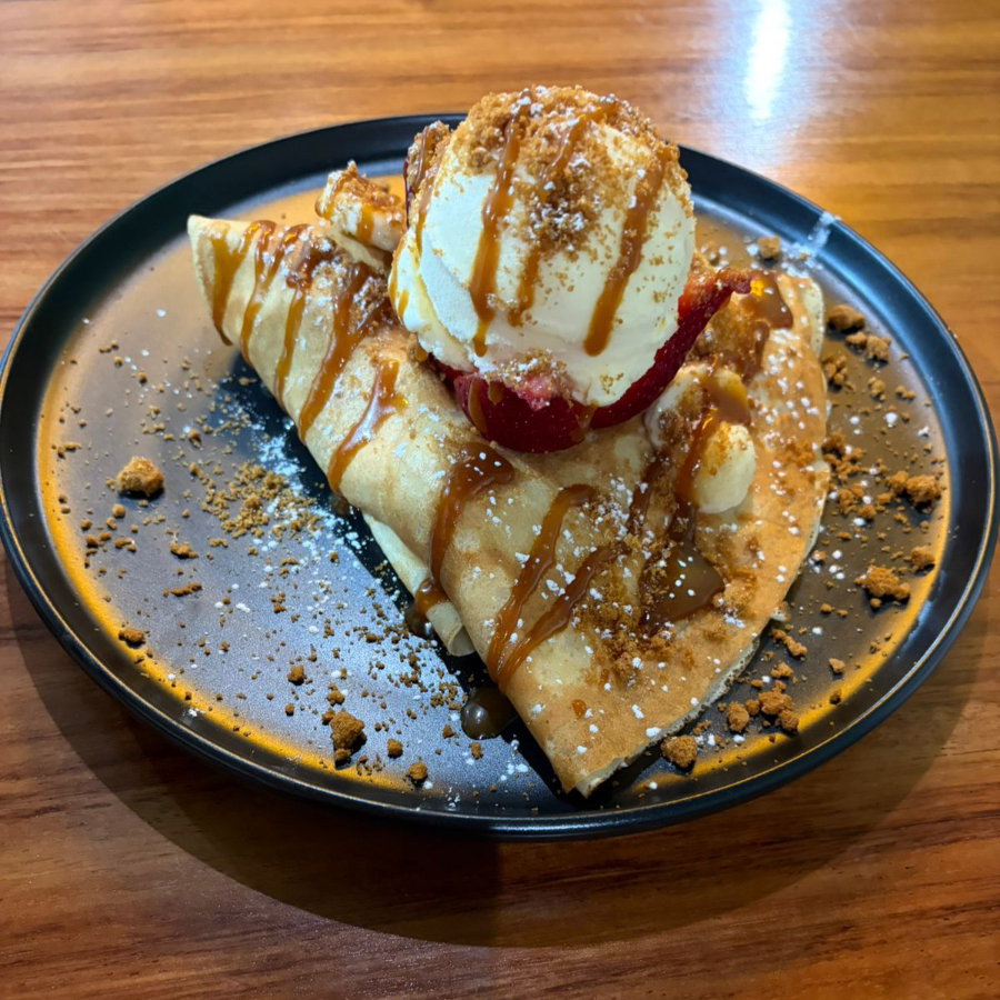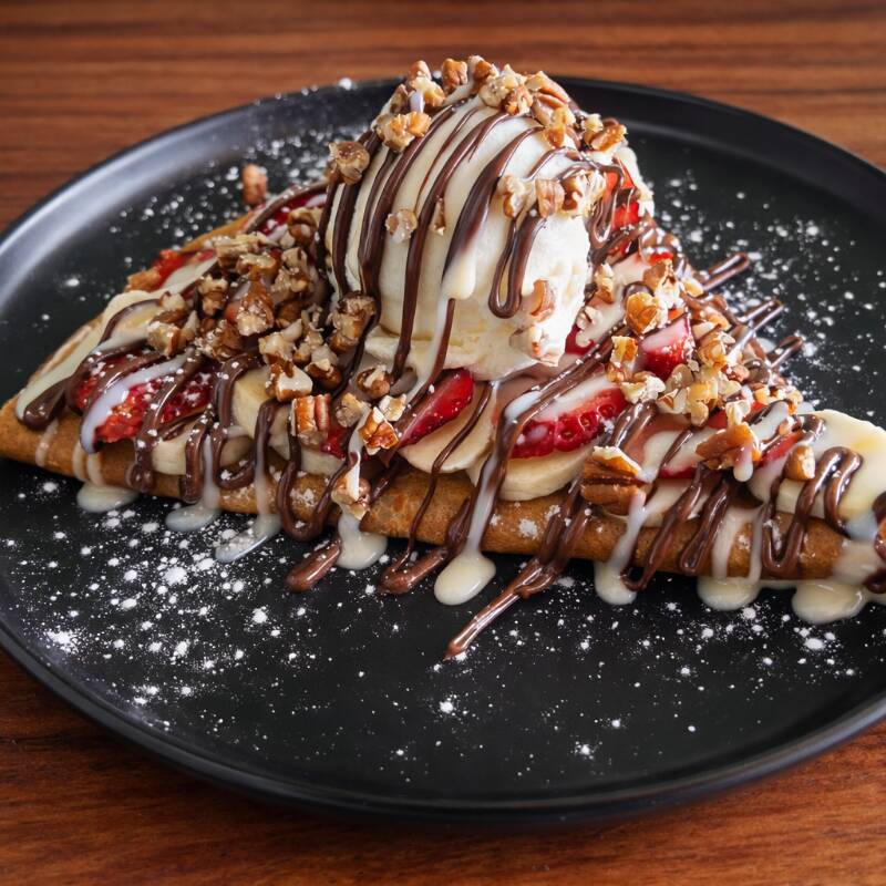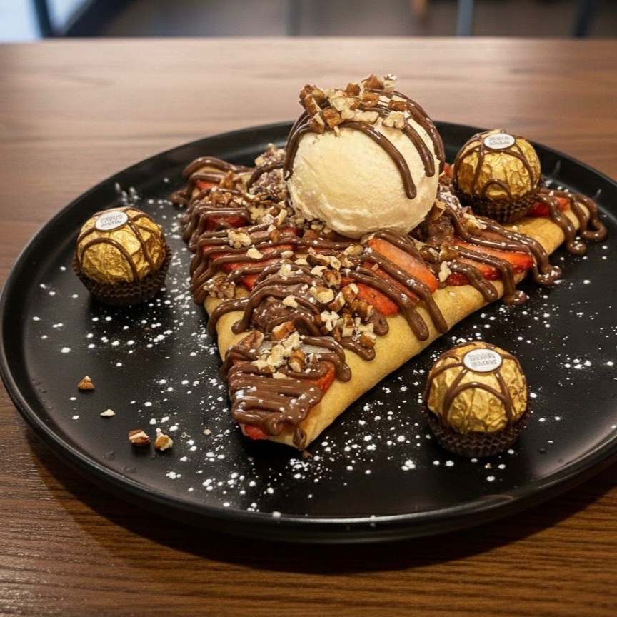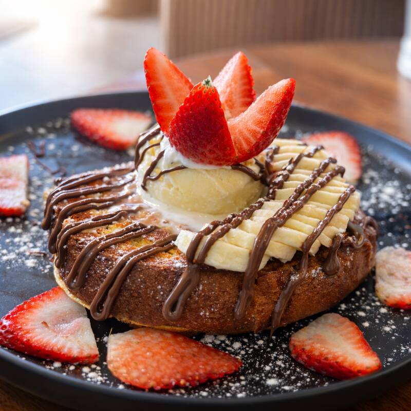 Dos piezas de pan francés dorado, acompañado de fresa, plátano fresco, Nutella y una bola de nieve
