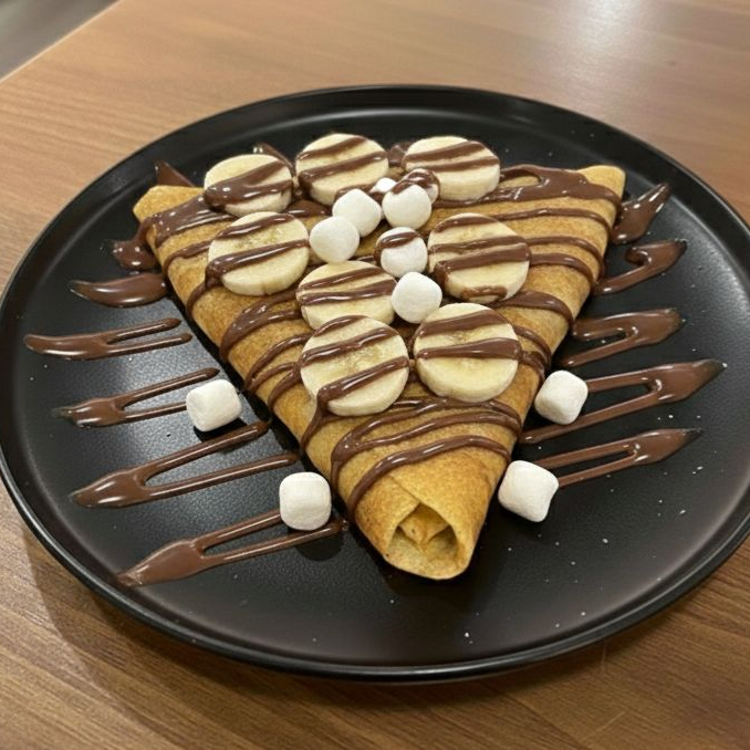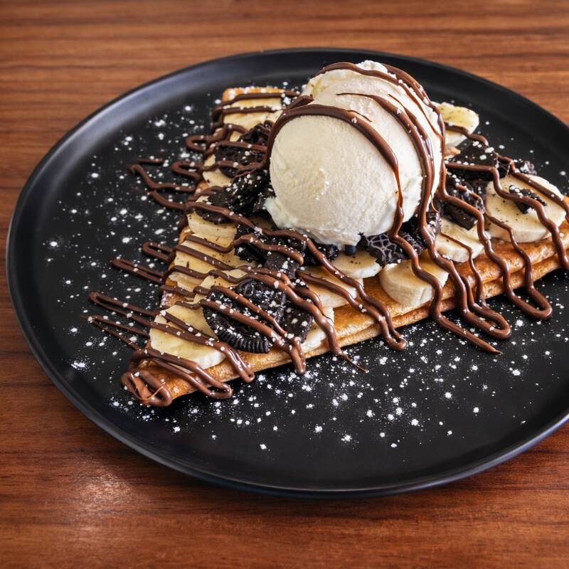 Dos piezas de pan francés dorado, acompañado de plátano fresco, nieve y lotus