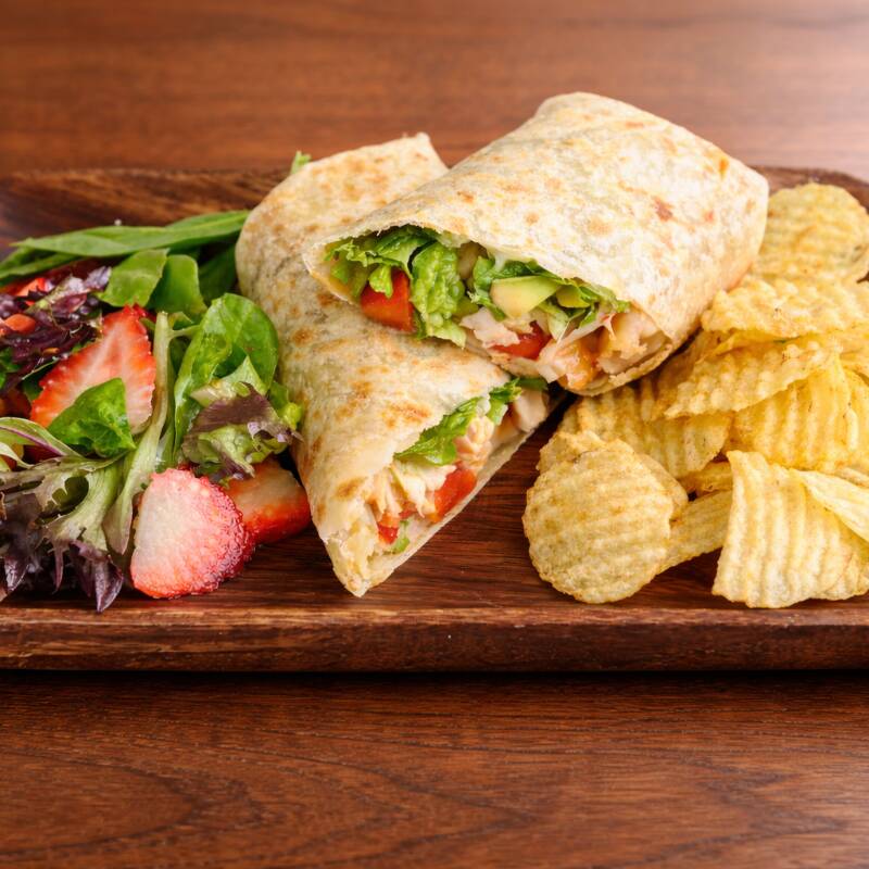 Tortilla de harina con pollo a la plancha, lechuga tomate, aguacate, queso fundido y aderezo spicy- ranch