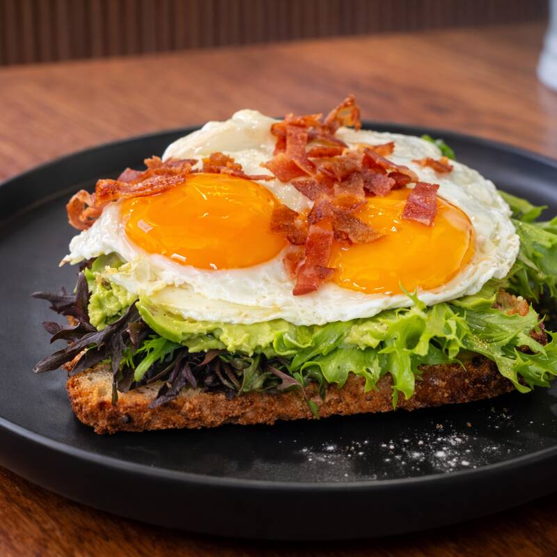 Pan tostado, aguacate, espinacas, huevos revueltos, queso panela, tomate cherry, tocino y aderezo chipotle