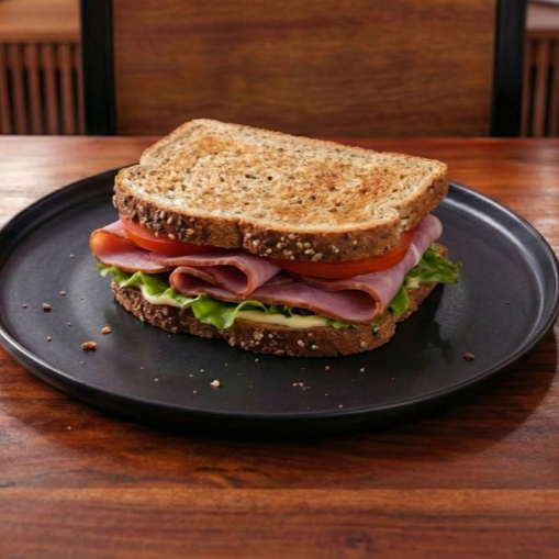 Pan doce granos, jamón, queso suizo americano, lechuga, tomate y aguacate