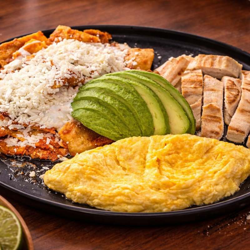 Omelette relleno de pollo, tocino y queso, acompañado de una porción de chilaquiles