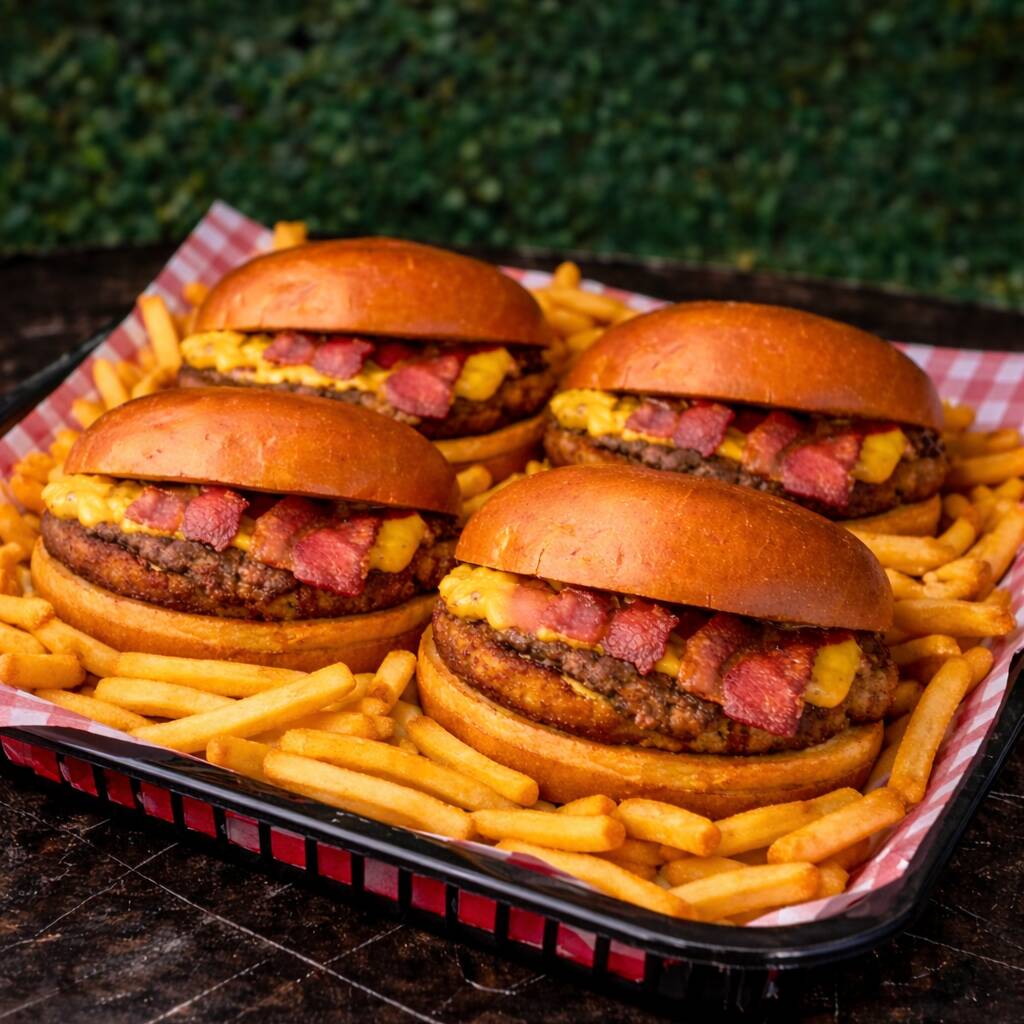 Pan brioche, aderezo de la casa, triple carne smash, triple queso amarillo, cebolla caramelizada, pepinillos, mostaza y catsup.