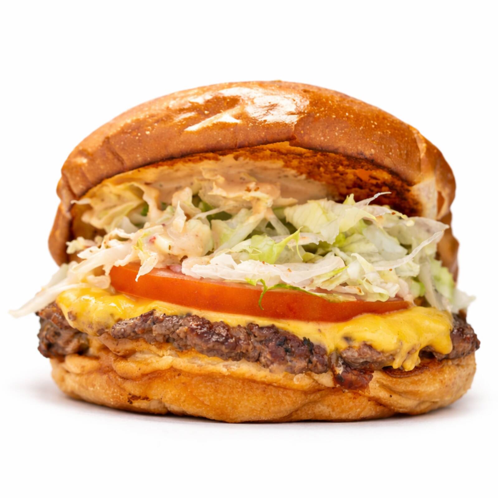 Pan brioche, aderezo de la casa, doble carne smash, doble queso amarillo, lechuga, tomate, cebolla caramelizada y pepinillos.
