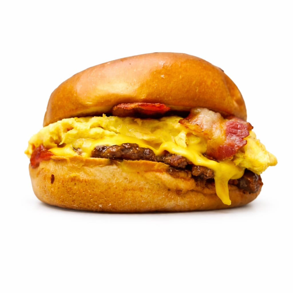 Pan brioche, aderezo de la casa, carne smash, huevo, queso y tocino.