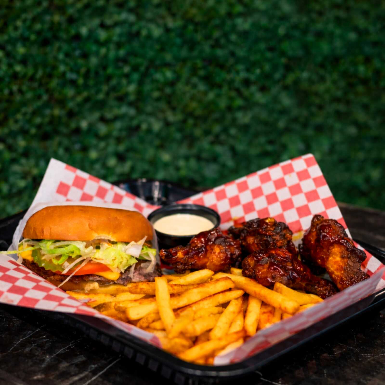 1 Bacon cheeseburger + smash fries + 1/2 alitas