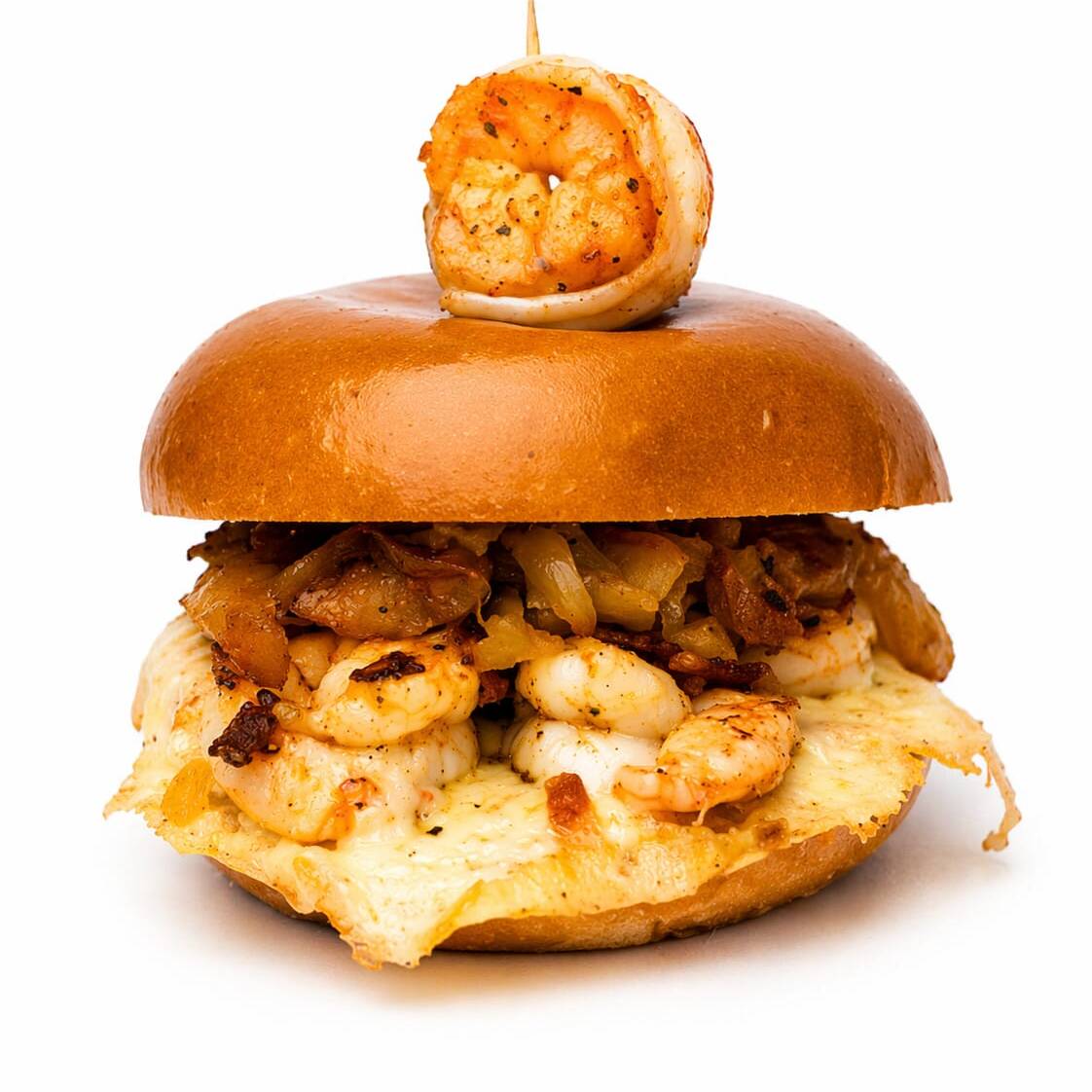 Pan brioche, aderezo de la casa, camarón. queso suizo, cebolla caramelizada, y salsa de piña con tocino.