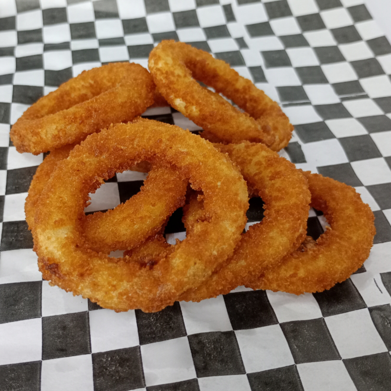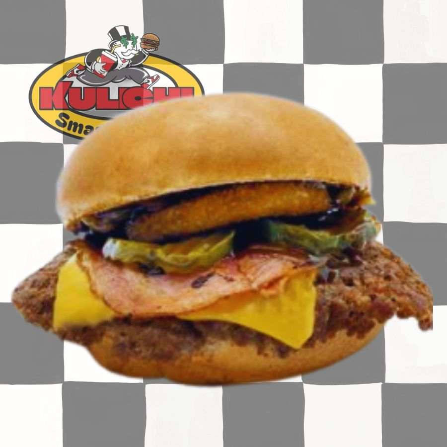 Pan brioche, BBQ, aros de cebolla, carne queso amarillo, tocino y cebolla caramelizada.