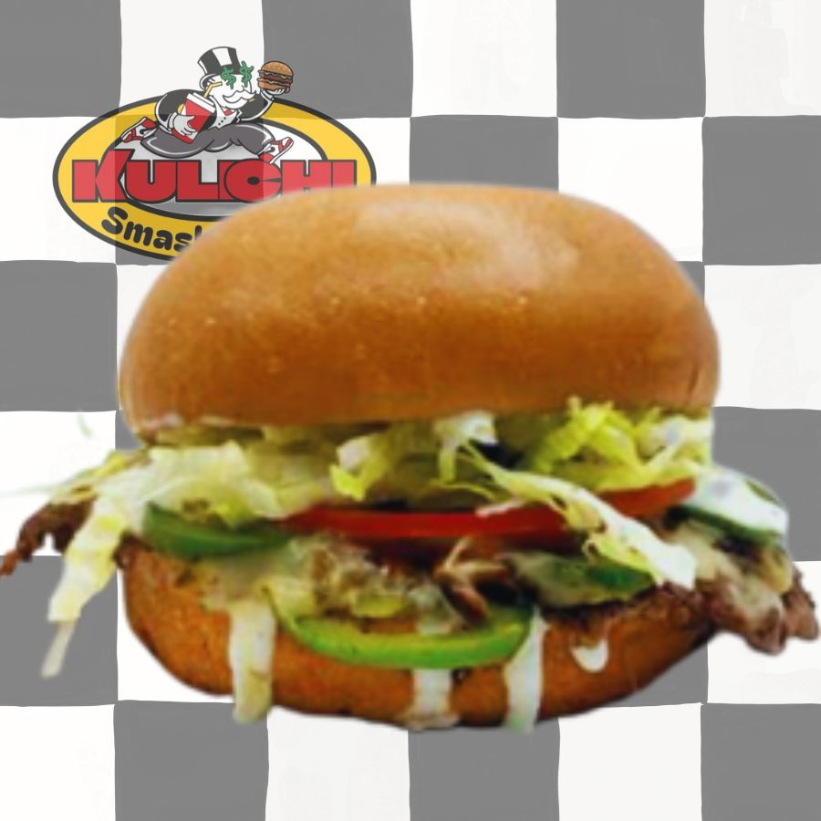 Pan brioche, aderezo de jalapeño, carne con jalapeño, queso pepper jack, lechuga y tomate.