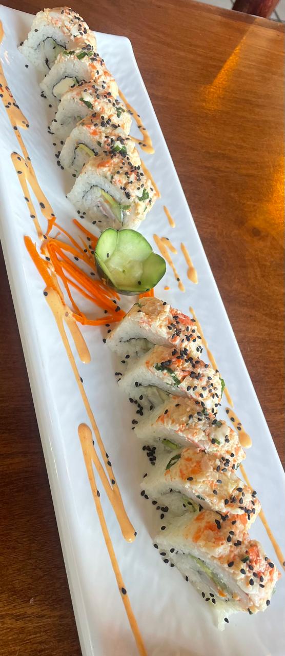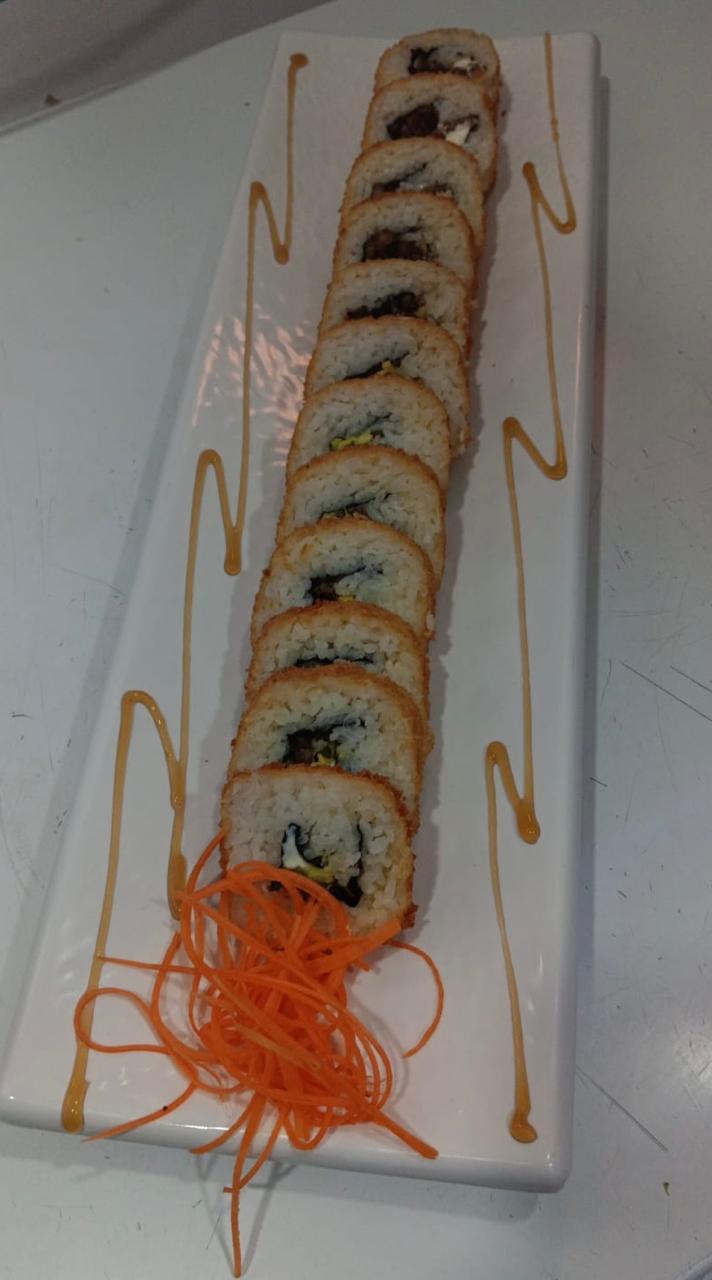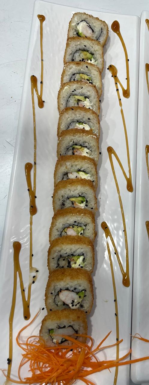 Surimi empanizado, aguacate y queso, cubierto con queso gratinado y camarón empanizado con salsa anguila.
