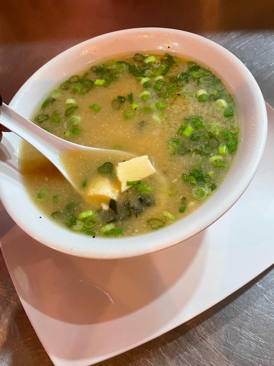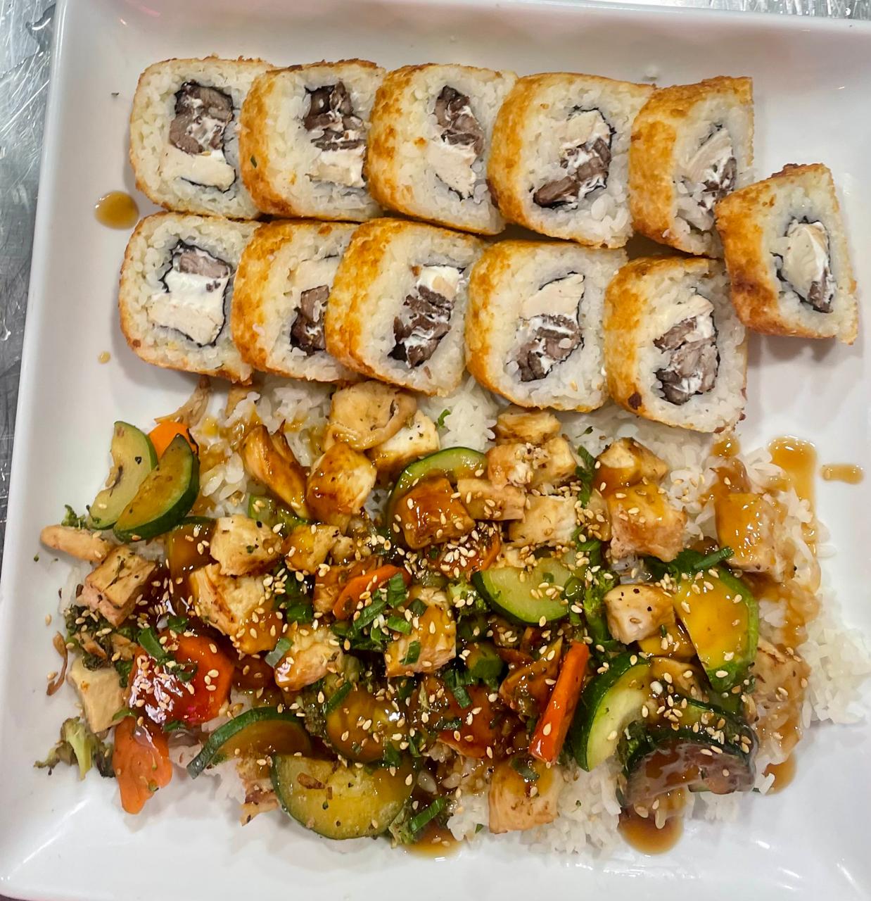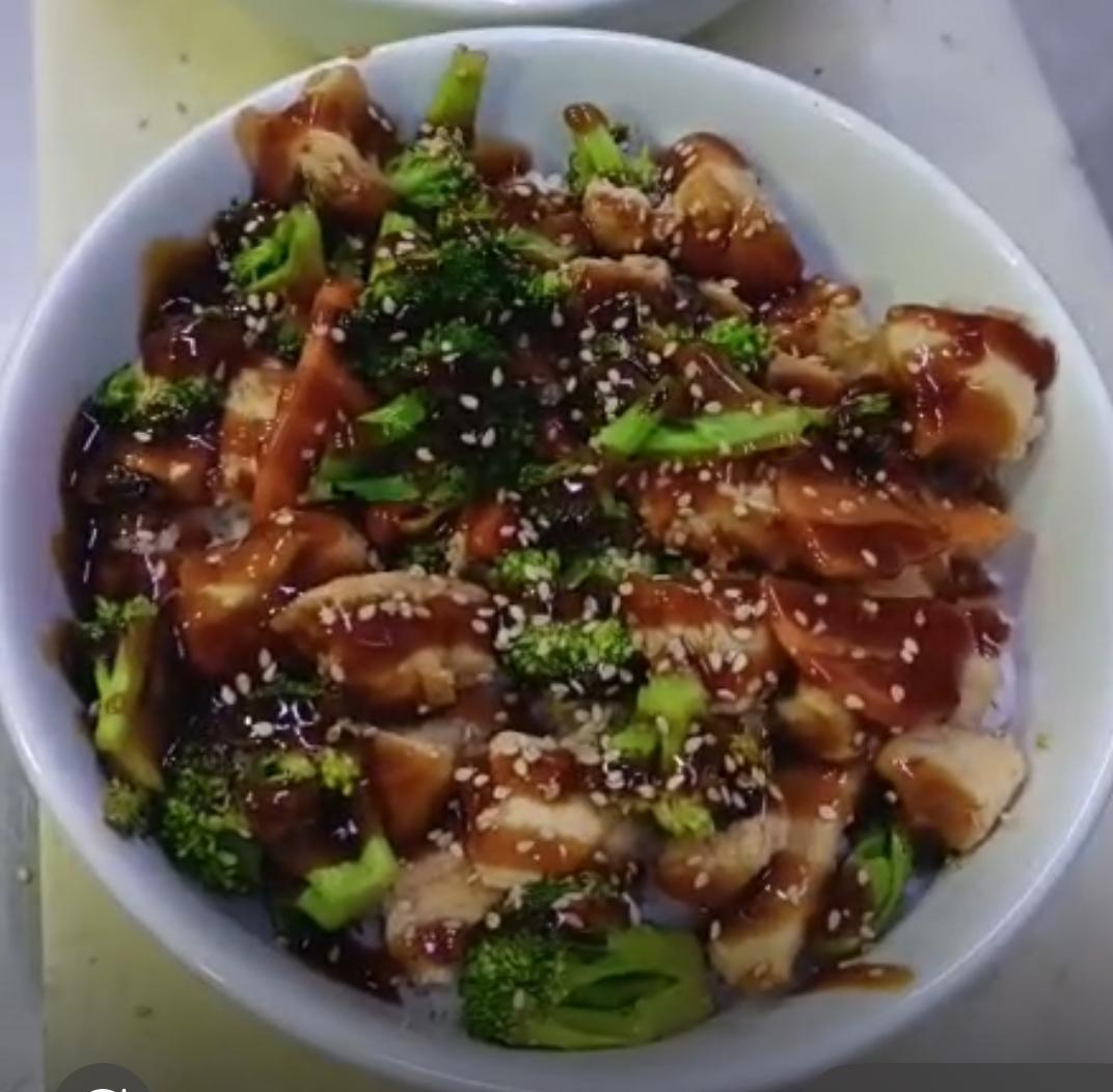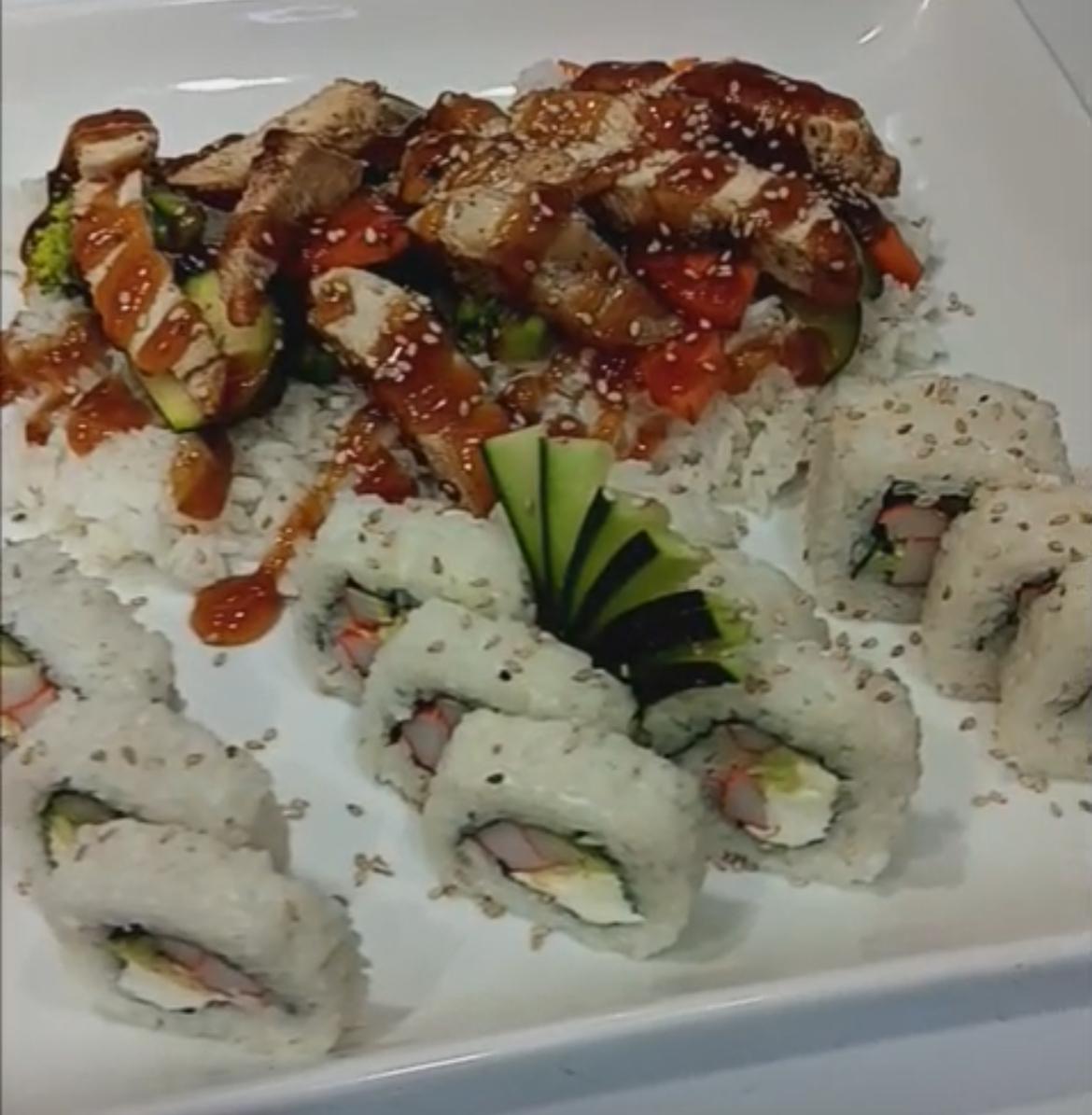 Camarones, pechuga de pollo y res con calabaza, zanahoria y brócoli con arroz, cubierto con salsa teriyaki, cebollín y ajonjolí.