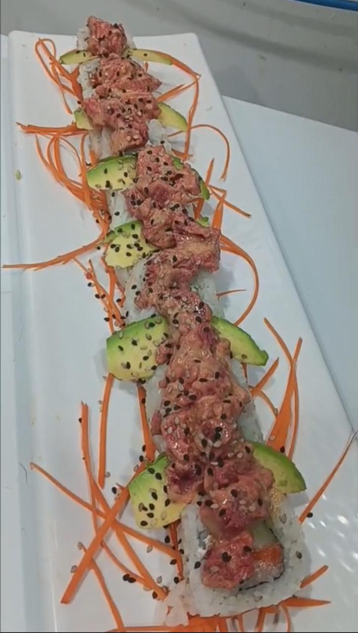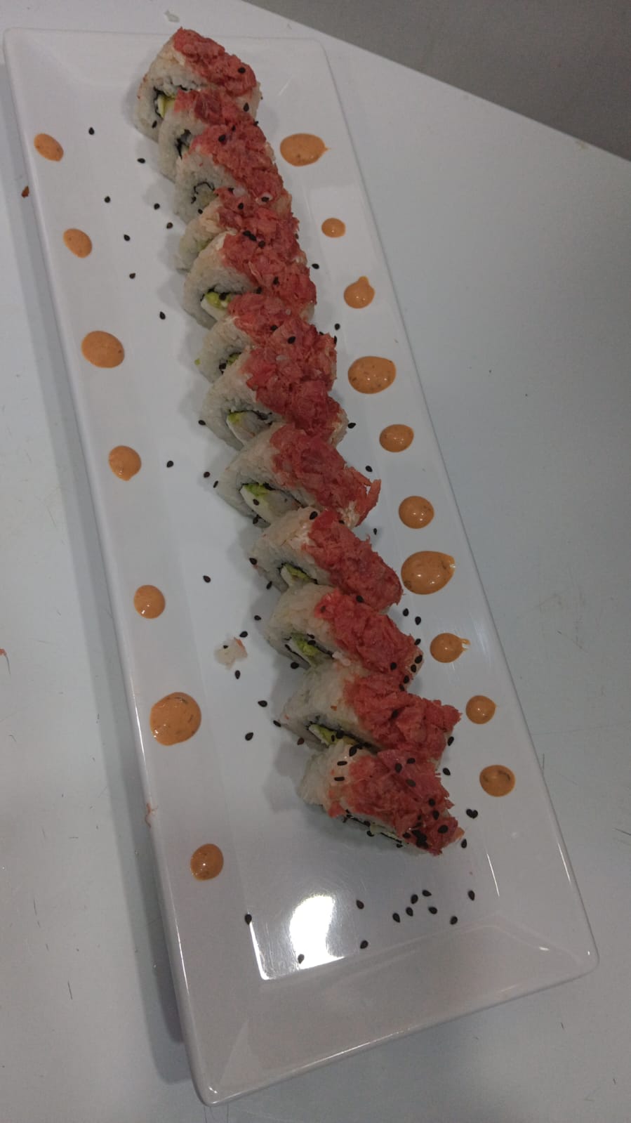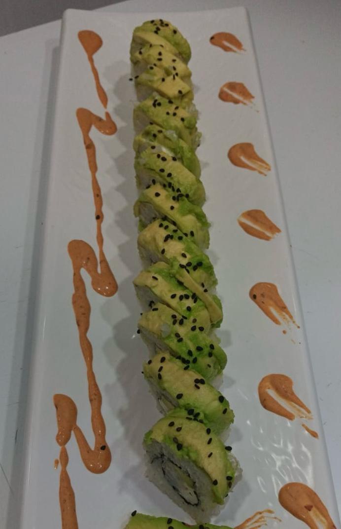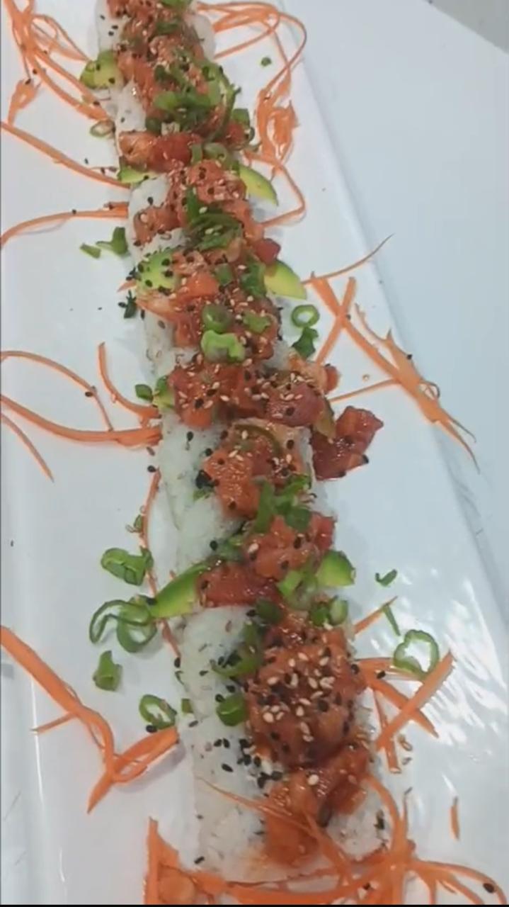 Salmón, pepino, queso y aguacate, cubierto de aguacate, atún y salsa spicy de la casa.