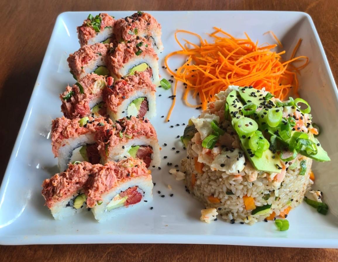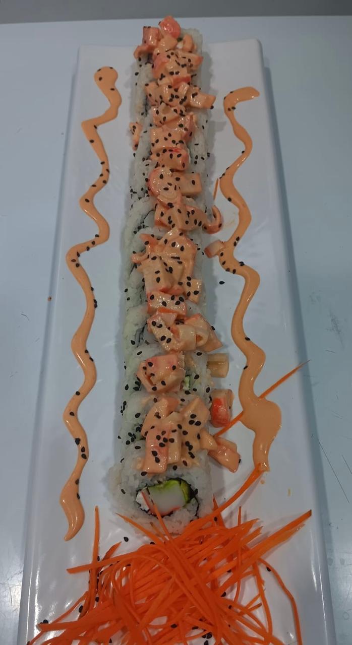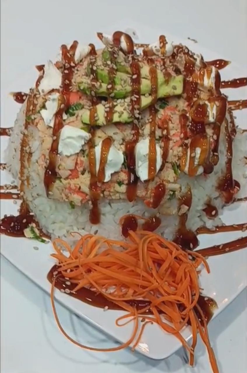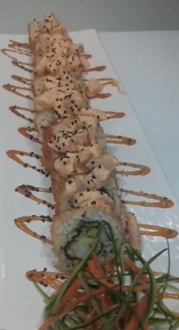 Salmón, pepino, queso y aguacate, cubierto de aguacate, atún y salsa spicy de la casa.