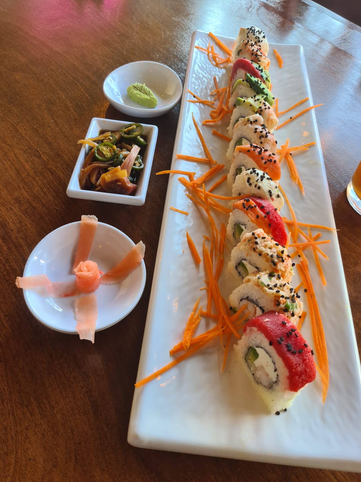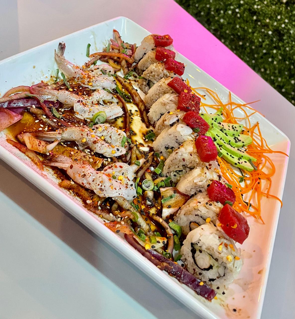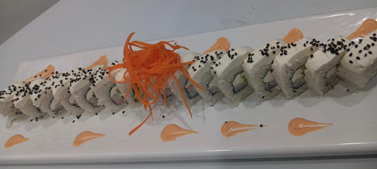 Camarón, pepino, queso, aguacate, cubierto de camarón, salmón, atún, surimi, tampico con queso gratinado y salsa spacy
