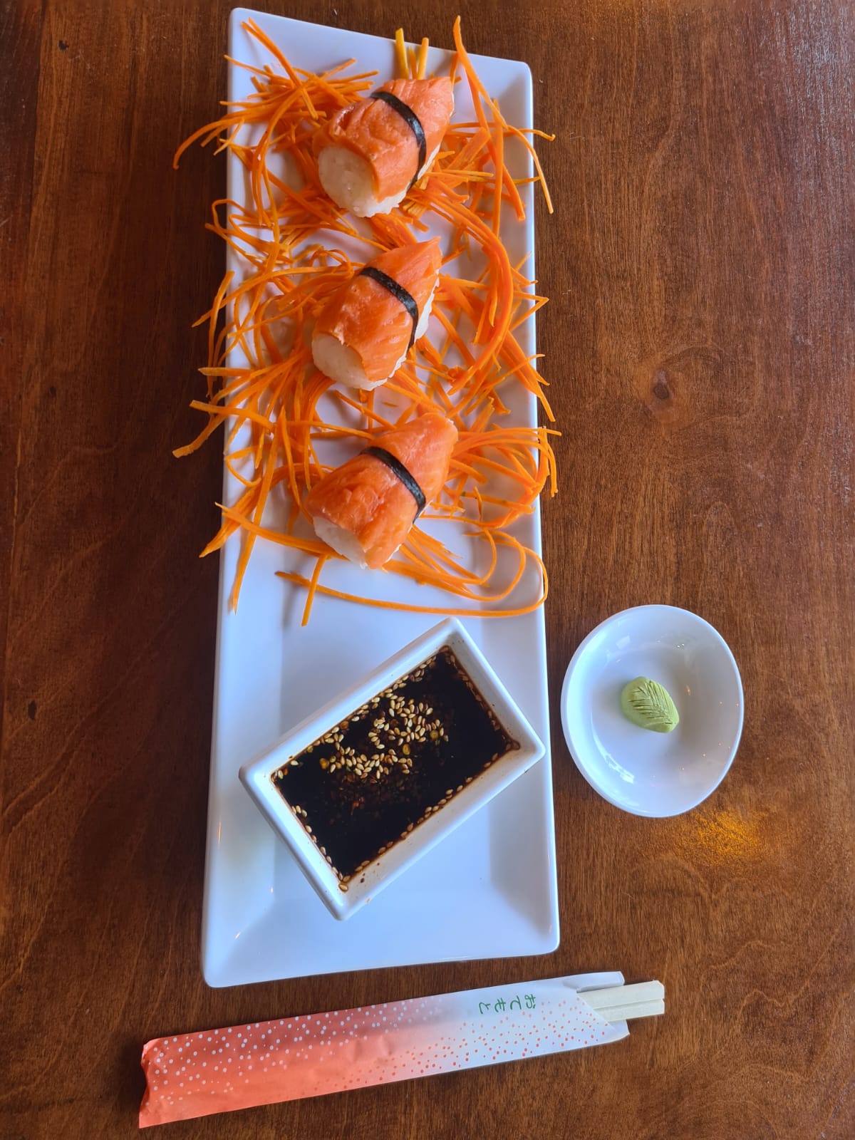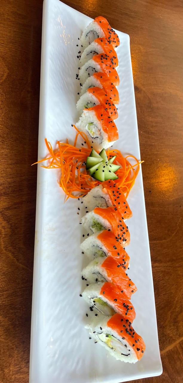 Roll sake con alga nori, arroz, aguacate, pepino y salmón ahumado.