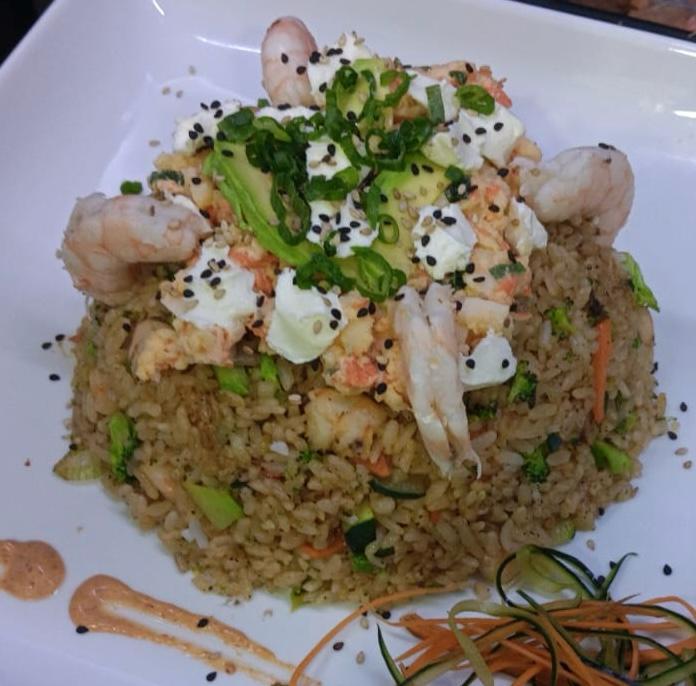 Pechuga, res y camarón salteados con arroz frito con calabaza, zanahoria, coronado con tampico, queso crema y aguacate