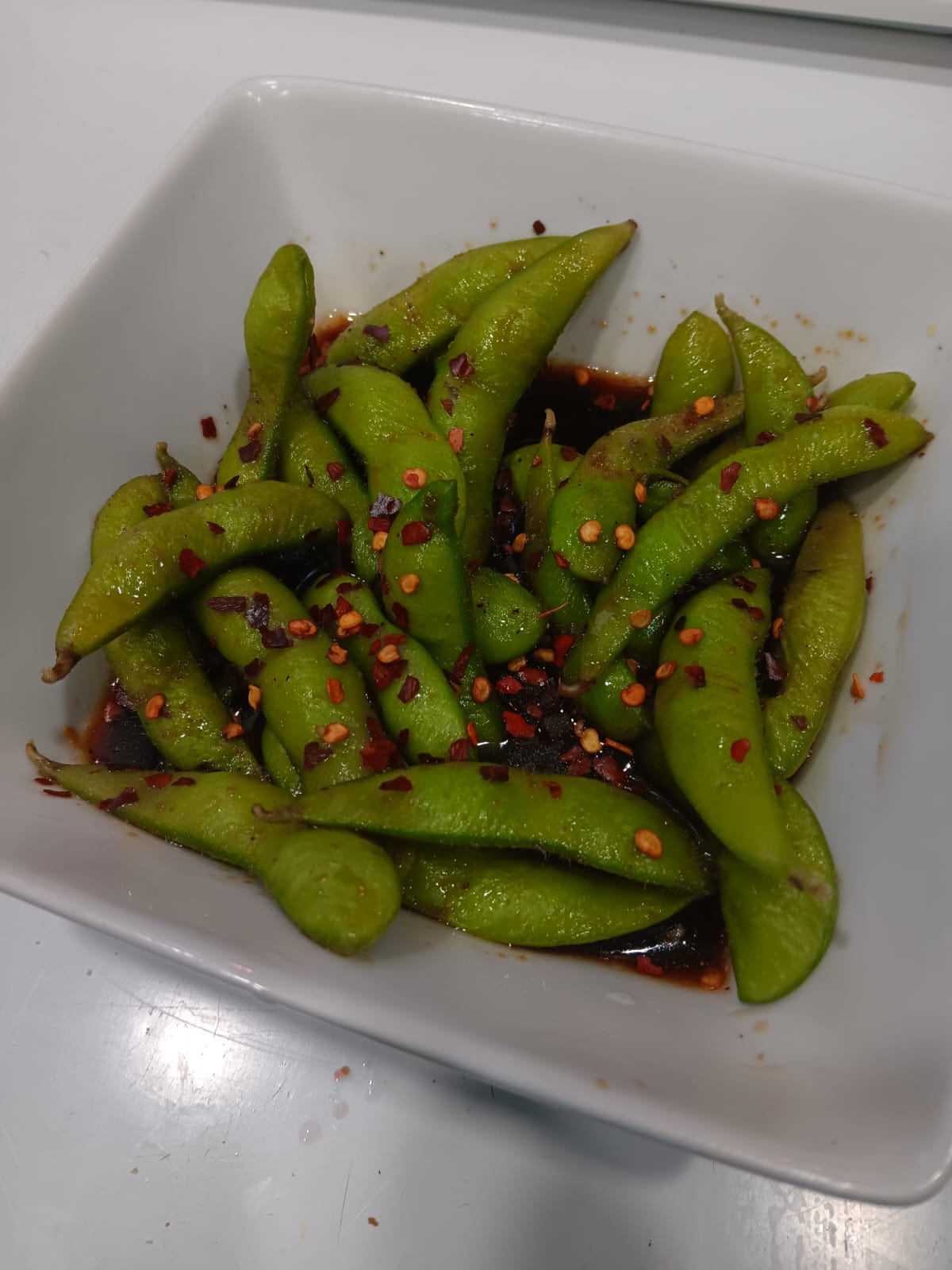 Vainas de soya al vapor con salsas ponzu y chile quebrado.
