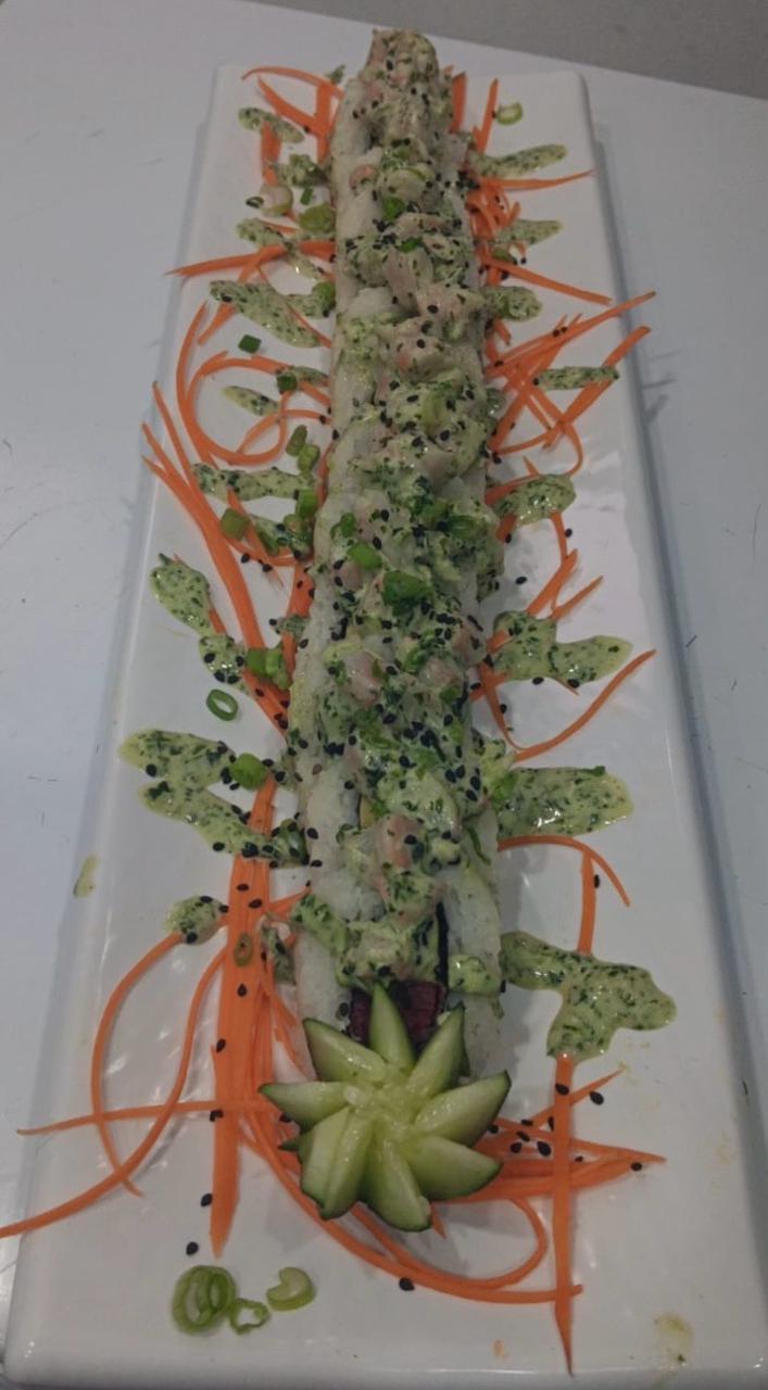 Atún, pepino, aguacate y queso, cubierto de camarón con aderezo de cilantro.