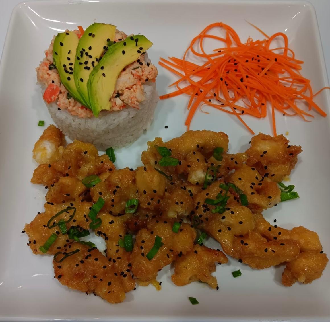 Pechuga de pollo en tempura con salsa de mango, habanero, arroz, tampico, aguacate, queso crema, cebollín y ajonjolí.