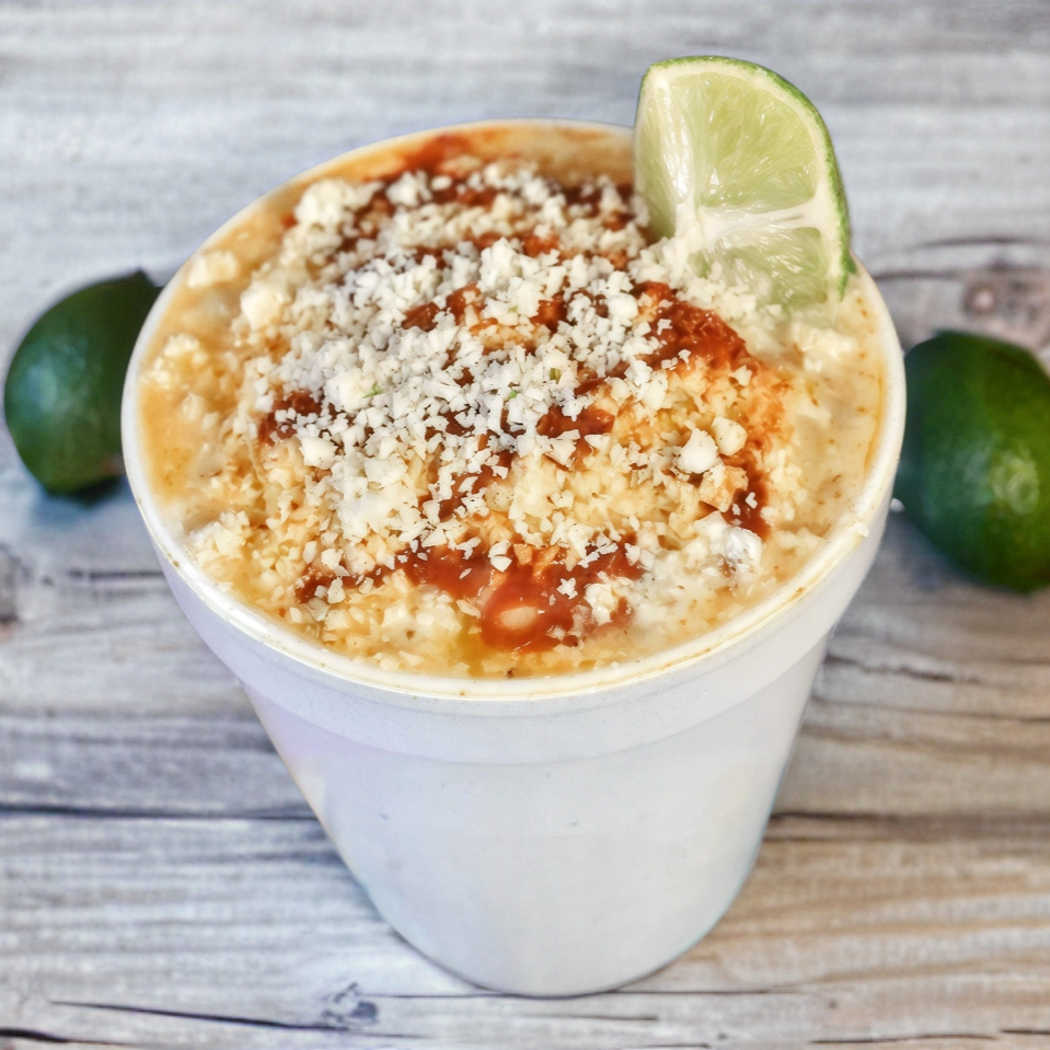 Mayonesa, queso cotija, queso amarillo, limón, salsa Valentina y salsa de la casa (salsas y Tajín se mandan por separado).