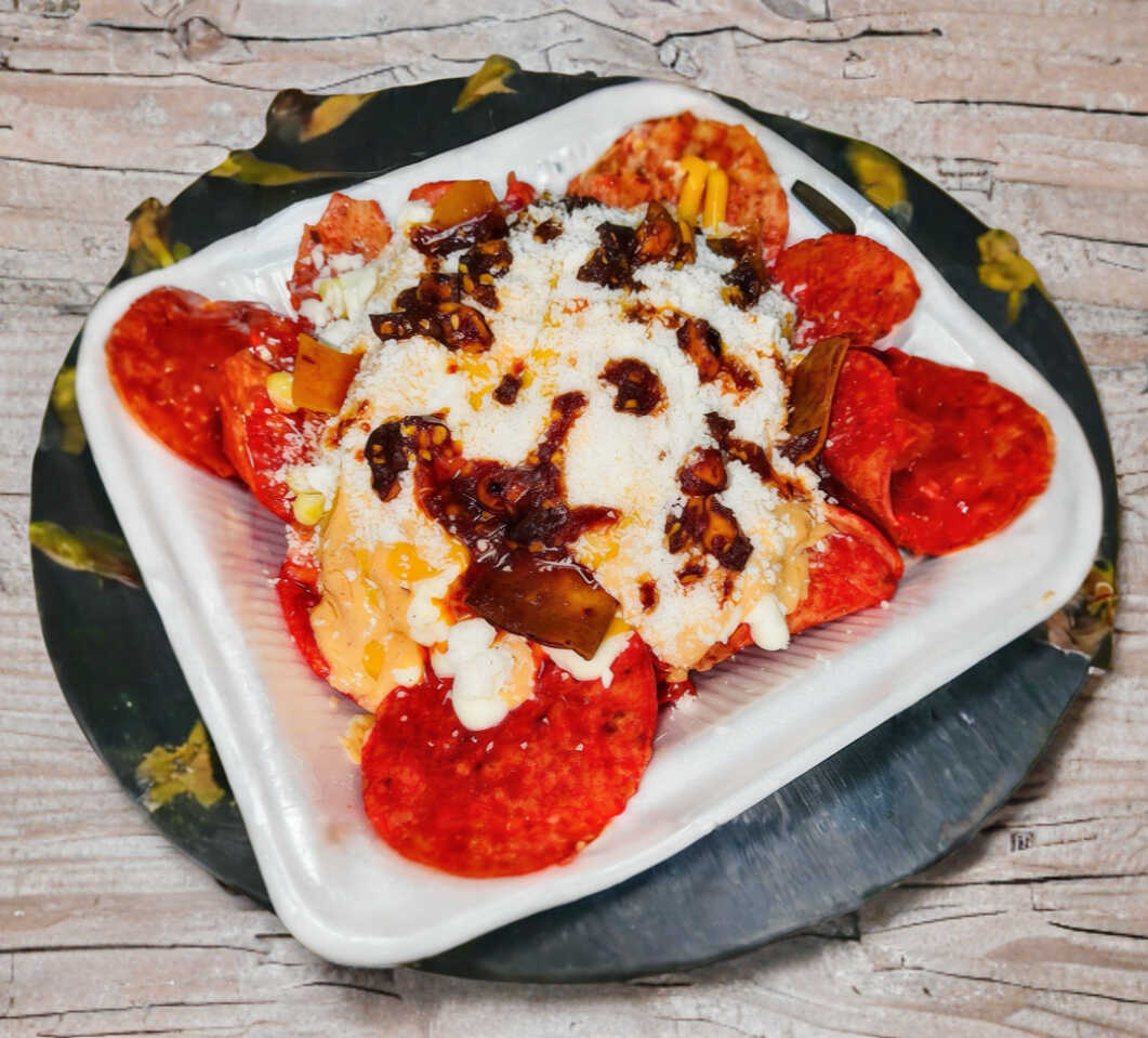 Tostitos flamin hot con mayonesa, mantequilla, queso cotija, limón, salsa Valentina, Tajín y salsa de la casa (salsas y Tajín se manda separado).