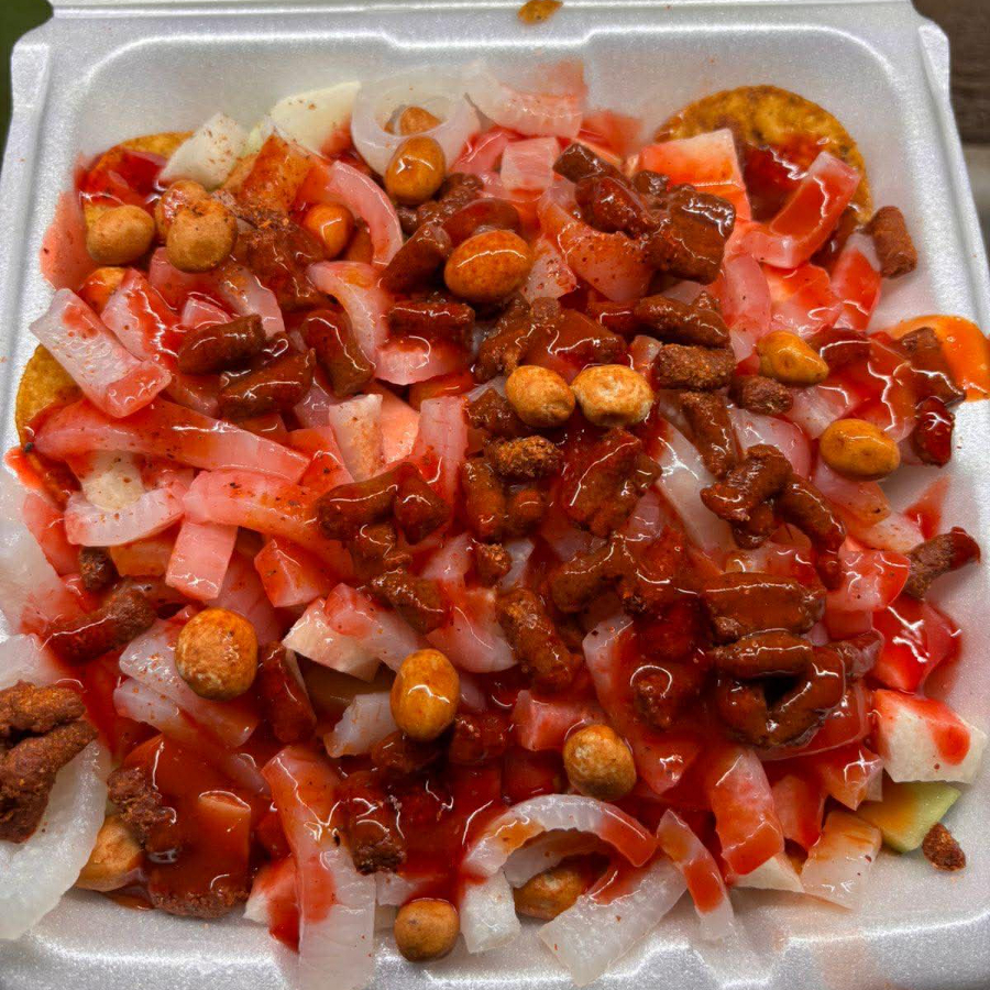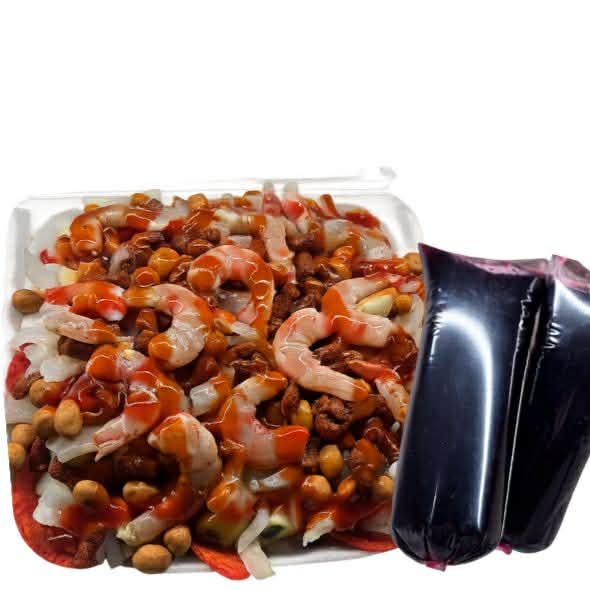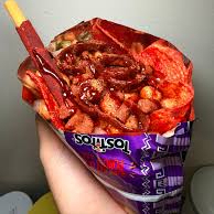 Tostilocos en charola 9X9 Tostitos rojos, pepino, jícama, cueritos, cacahuate, chaca chaca, chamoy, Salsa, limón, clamato, Tajín