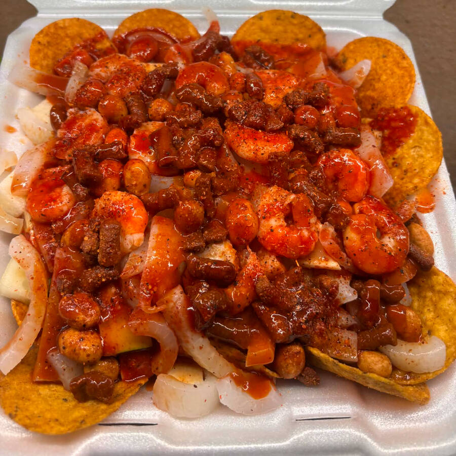Tostitos verdes, pepino, jícama, cueritos, chaca chaca, cacahuate, camarones, salsas negras, chamoy, salsa, Tajín, clamato