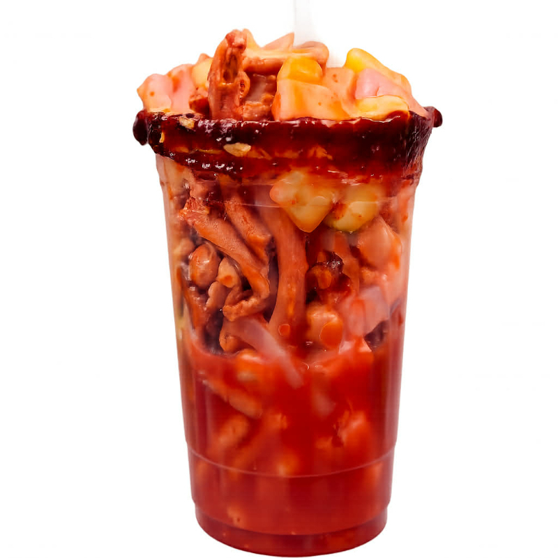 Churros locos 20 oz. Churros, pepino, jícama, cueritos, cacahuate, chaca chaca, chamoy, Salsa, limón, clamato, Tajín