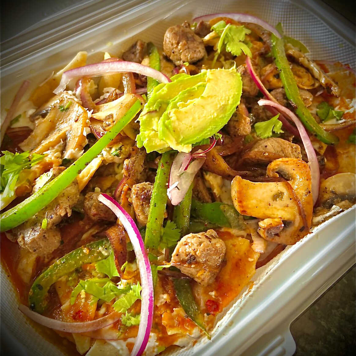 Chilaquiles con salsa de tú elección, fajitas de arrachera con pimiento, cebolla y champiñon , cilantro, queso , crema y aguacate.