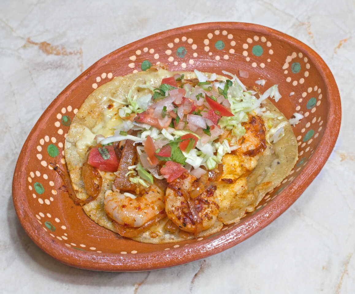 Quesadilla de camarón con chile morrón, cebolla blanca y tomate, al gusto de mariscos el compadre.
