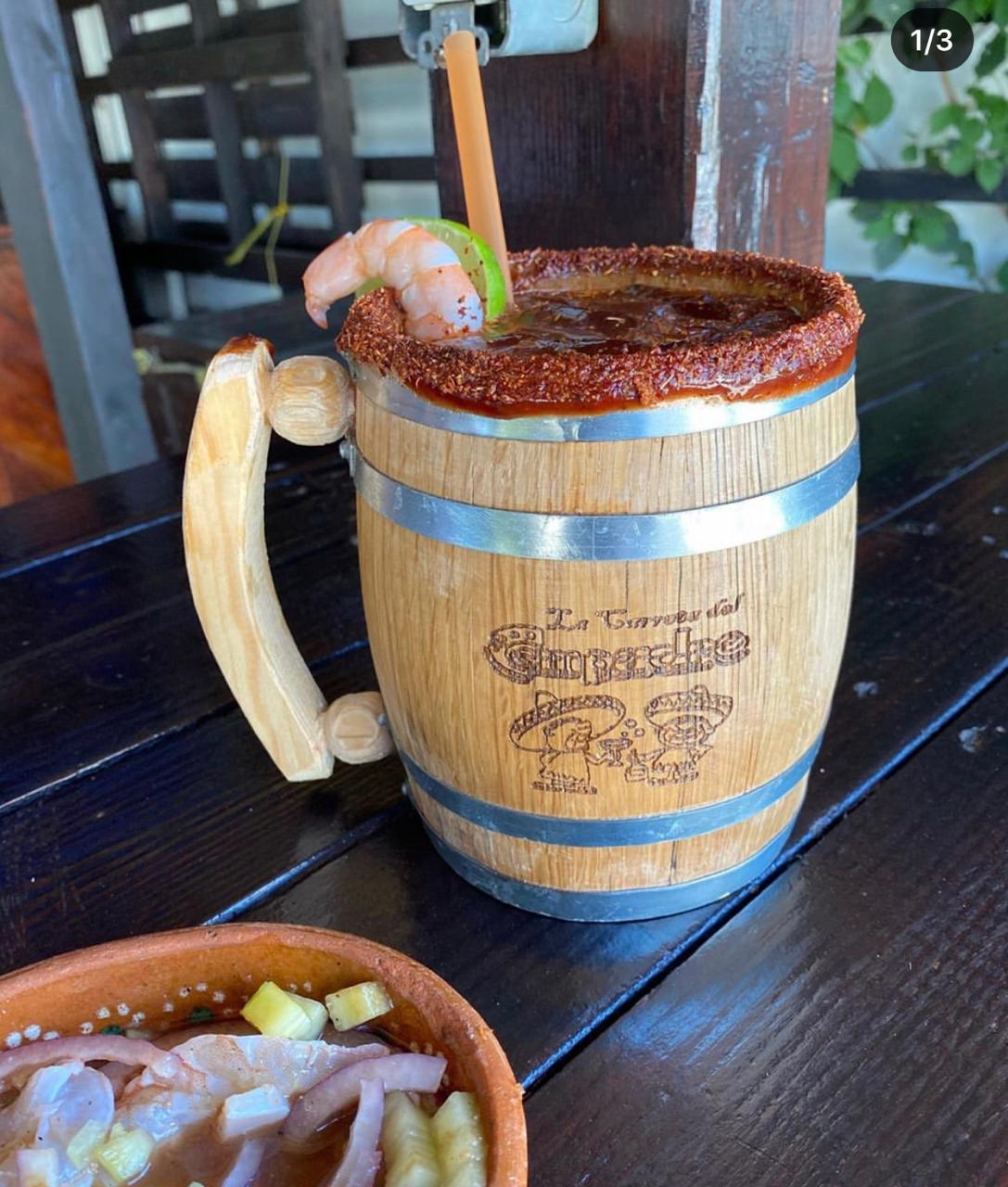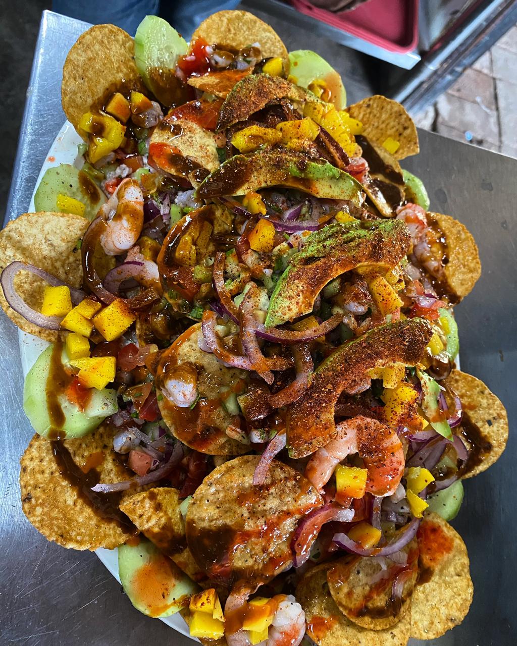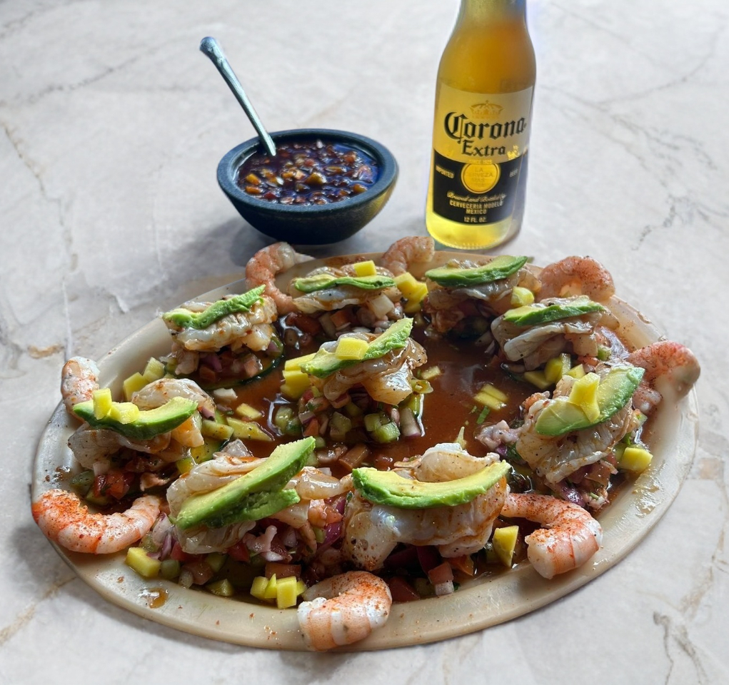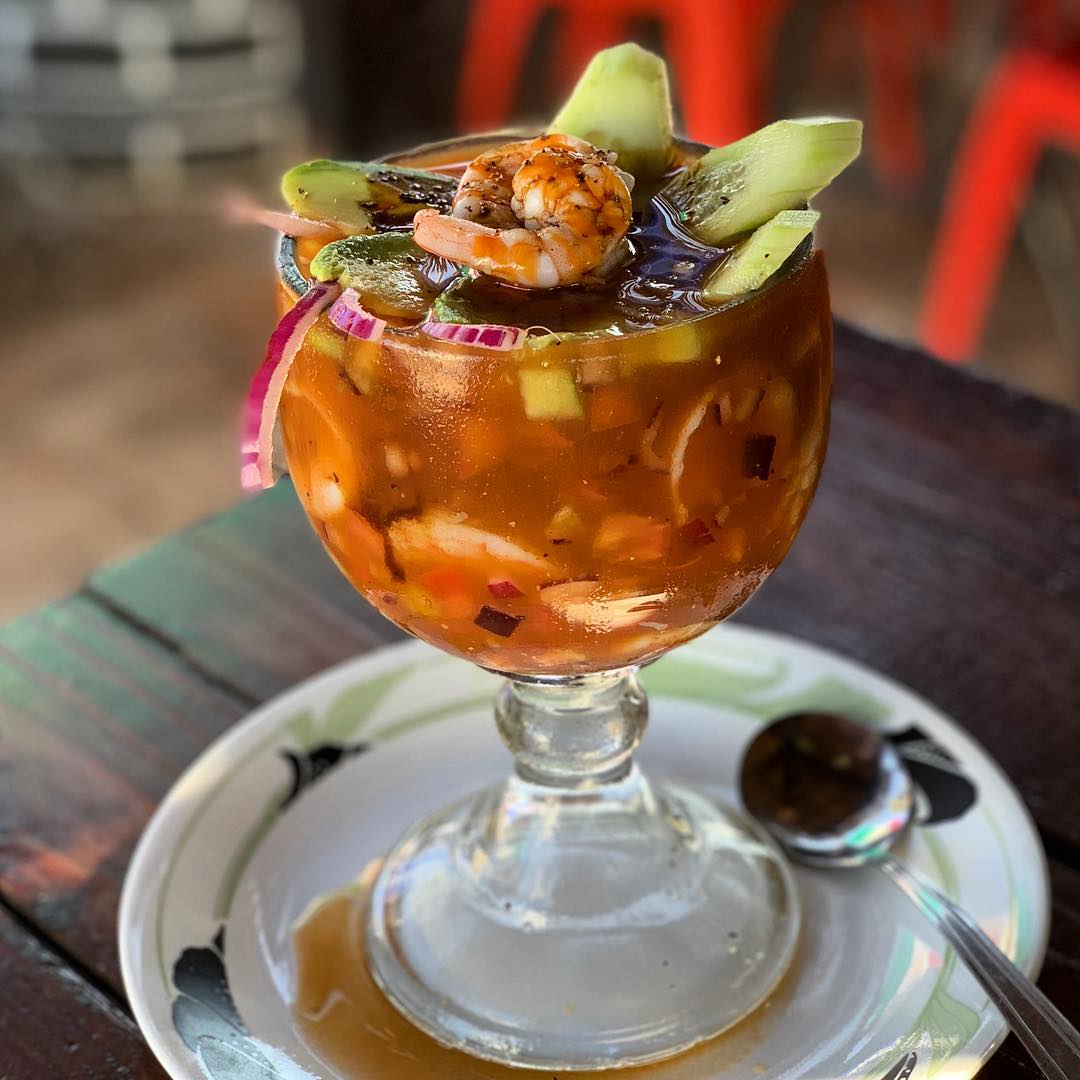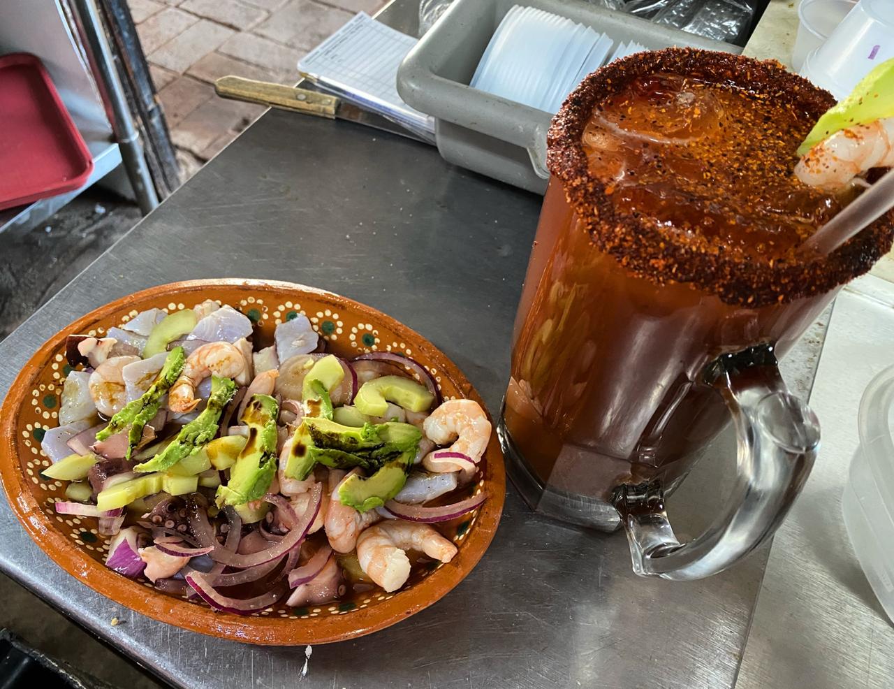 Ostión, pata, almeja, pulpo y camarón cocido. Viene con tomate, pepino y cebolla con sal y pimienta al gusto, jugo de camarón y un toque de Clamato.