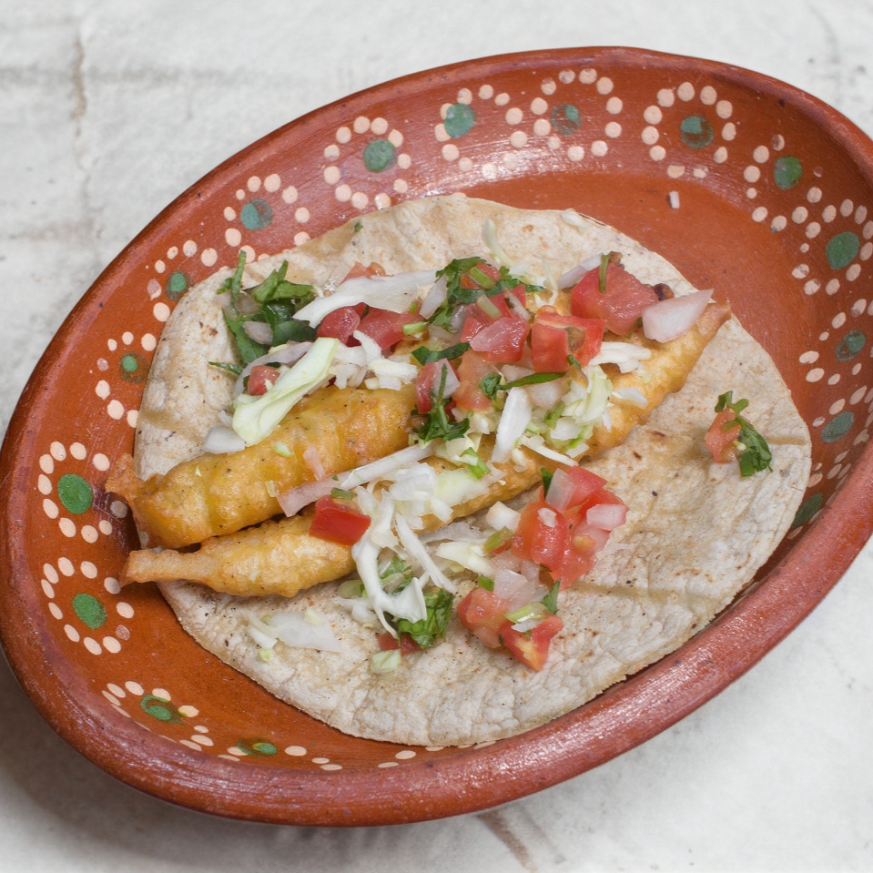 Taco de maíz con pescado capeado.