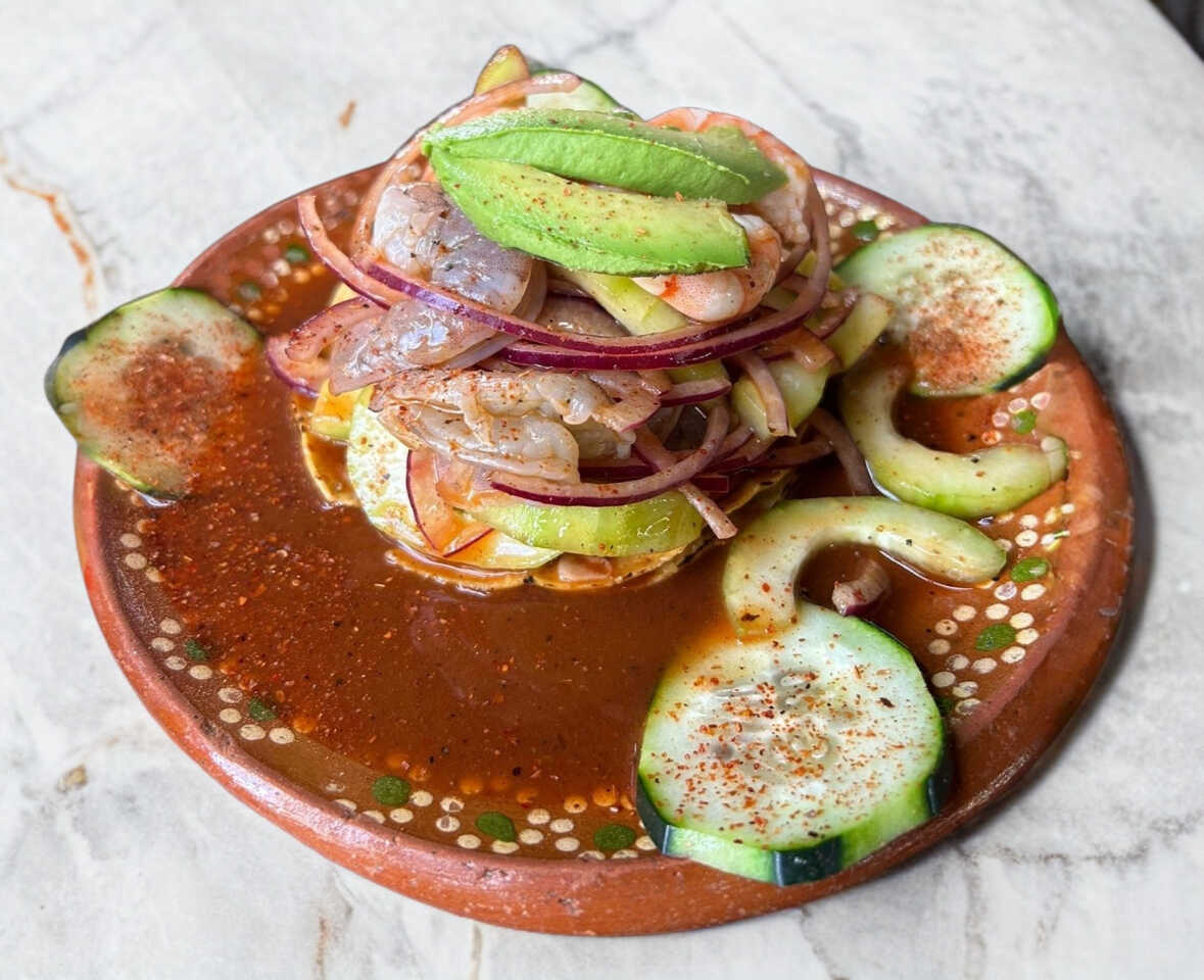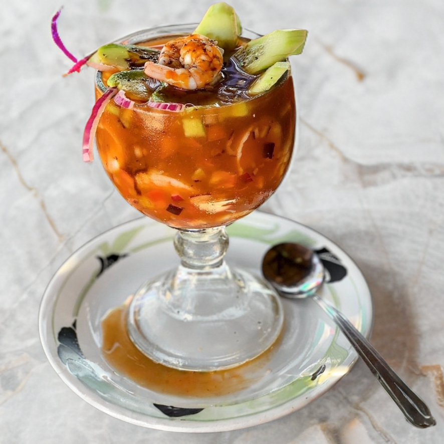 Camarón cocido con pepino tomate y cebolla morada. Se prepara con jugo de camarón y un toque de Clamato.