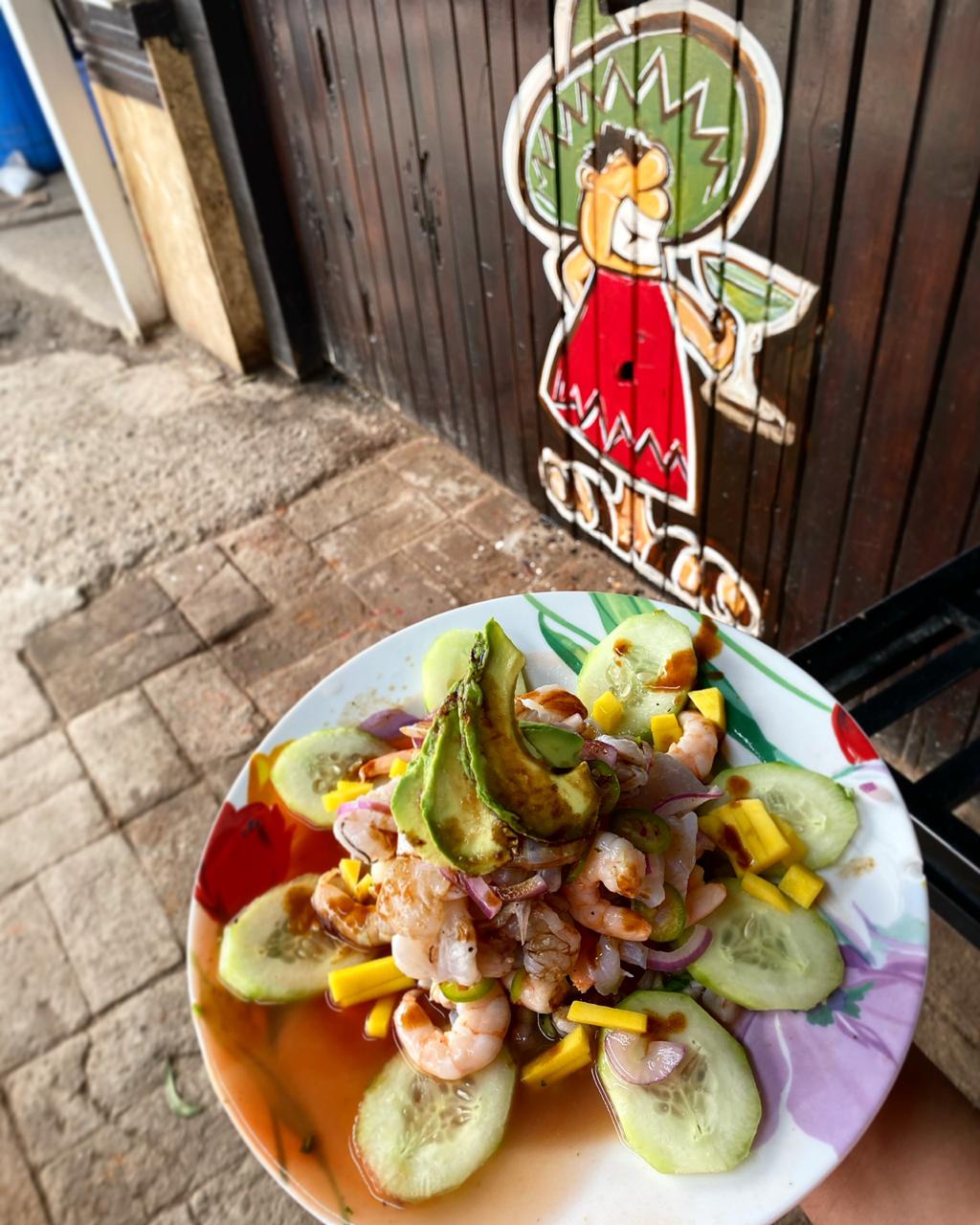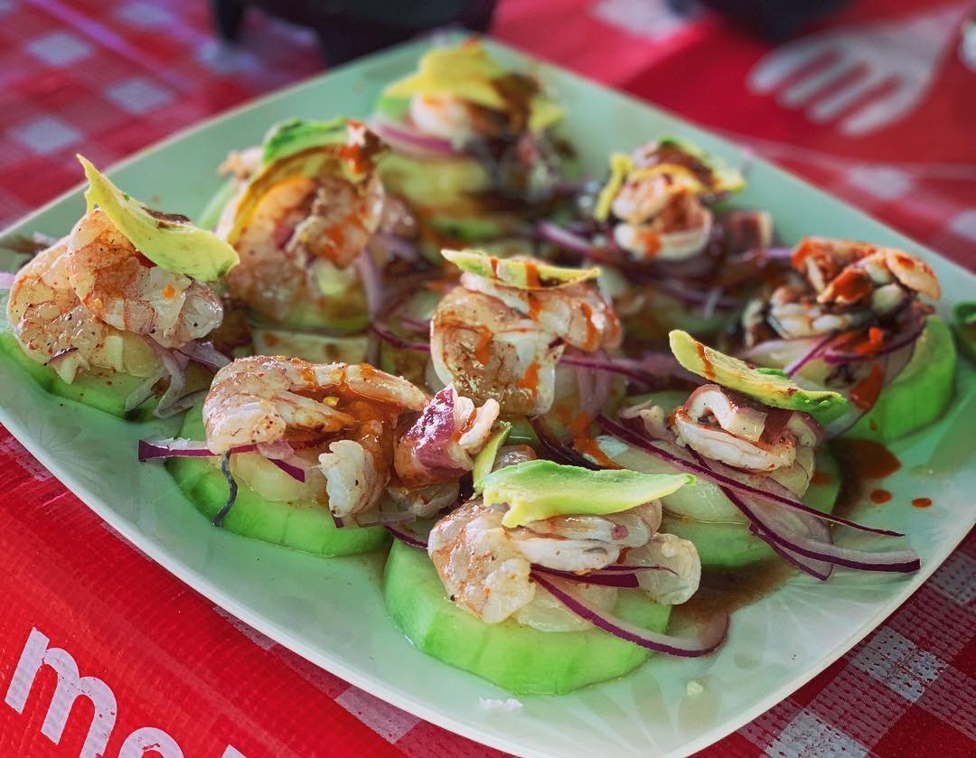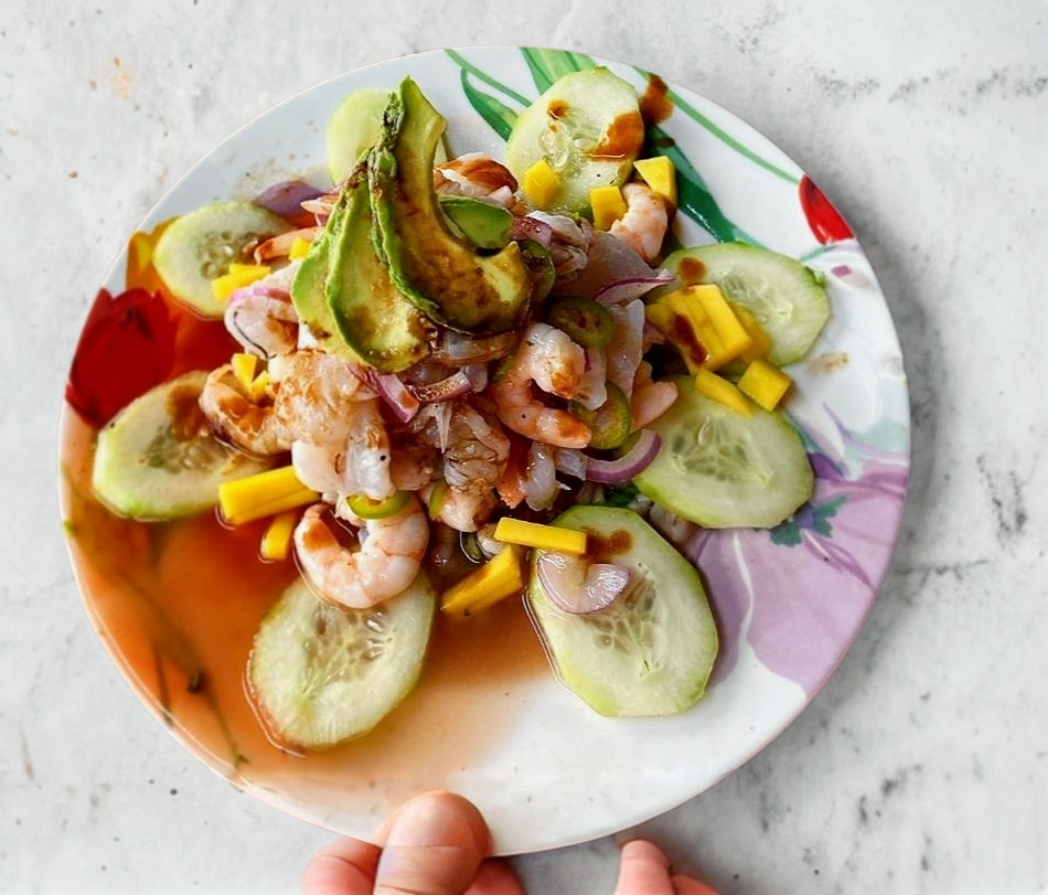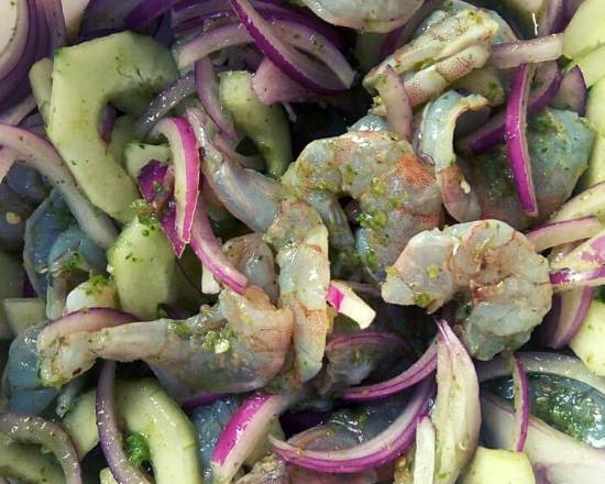 Camarones curtidos en limón, sal, pimienta, con cebolla morada y pepino.
