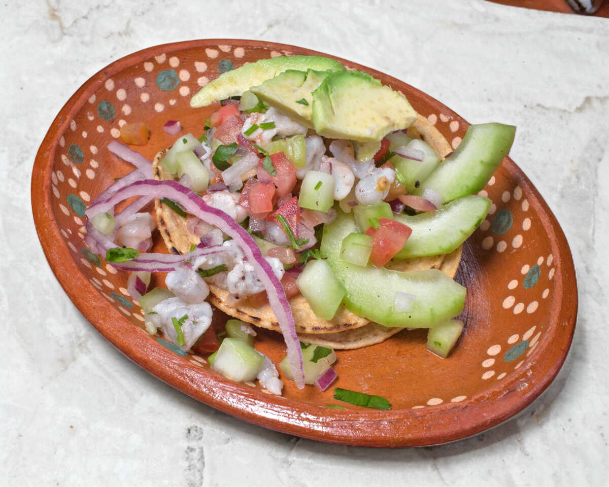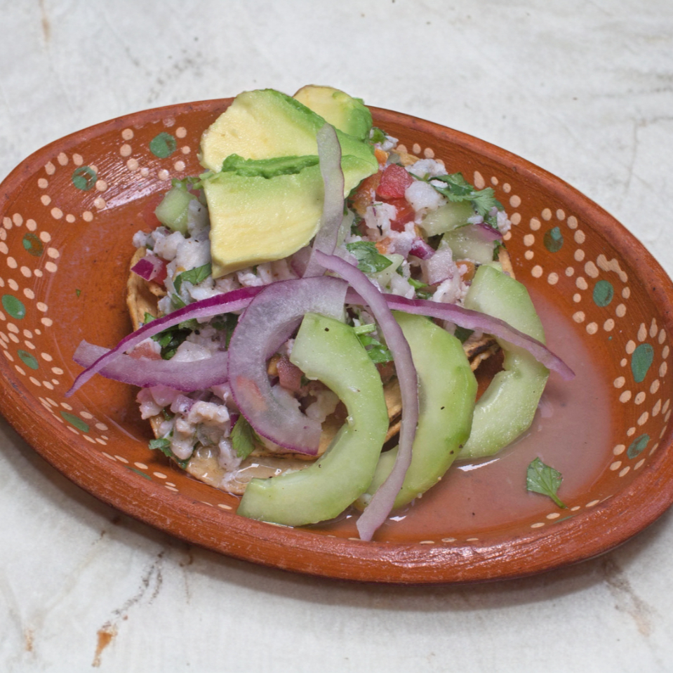 Tostada con una cama de ceviche de pescado, pulpo y camarón cocido preparado encima con aguacate. La tostada viene aparte.
