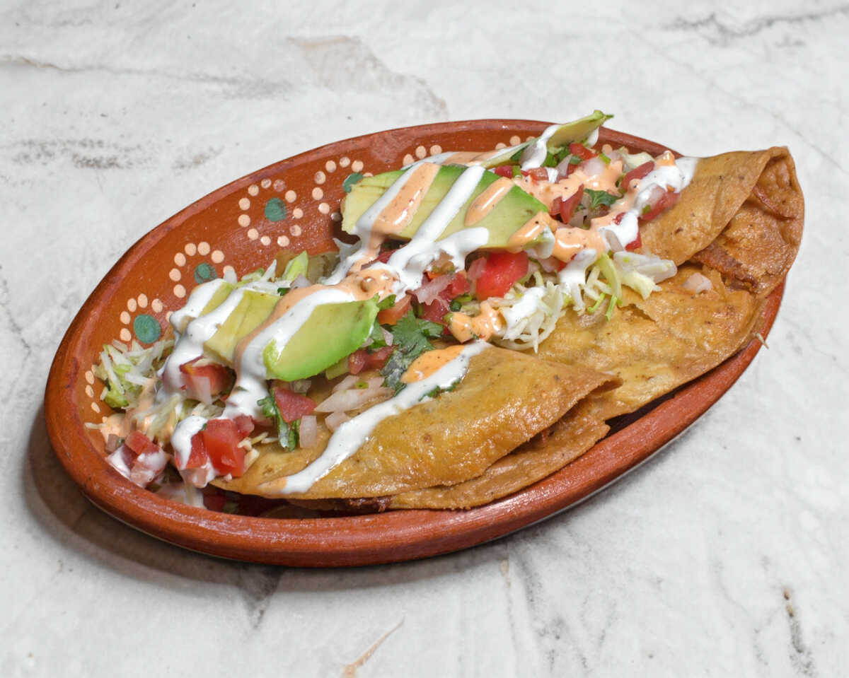 Quesadilla de marlín ahumado con chile morrón, cebolla blanca y tomate, al gusto de mariscos el compadre.