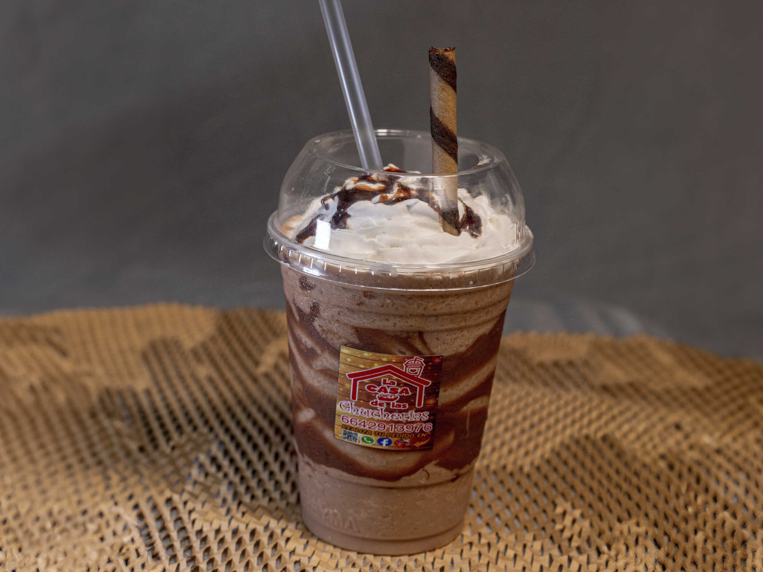 Leche evaporada, hielo, shot de café, crema batida y wafer stick vaso de 16 oz.